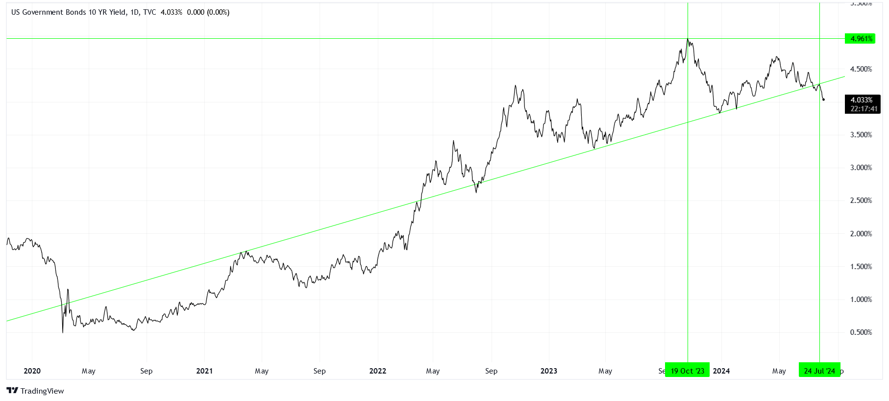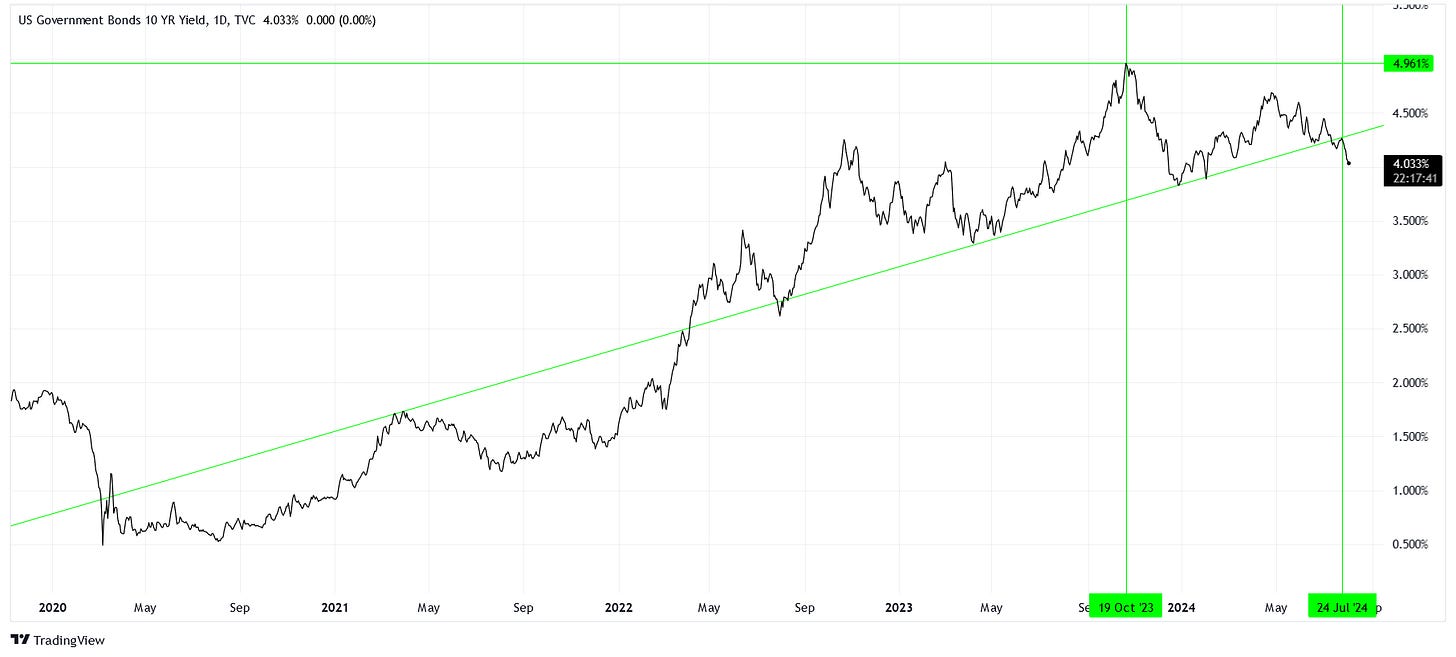 Ever since October 2023 when the 10-year Treasury note yield kissed 5%, we’ve dealt with a really massive level just above. It appears that April 2024 denotes another local peak where the yield reached close to 4.7%.