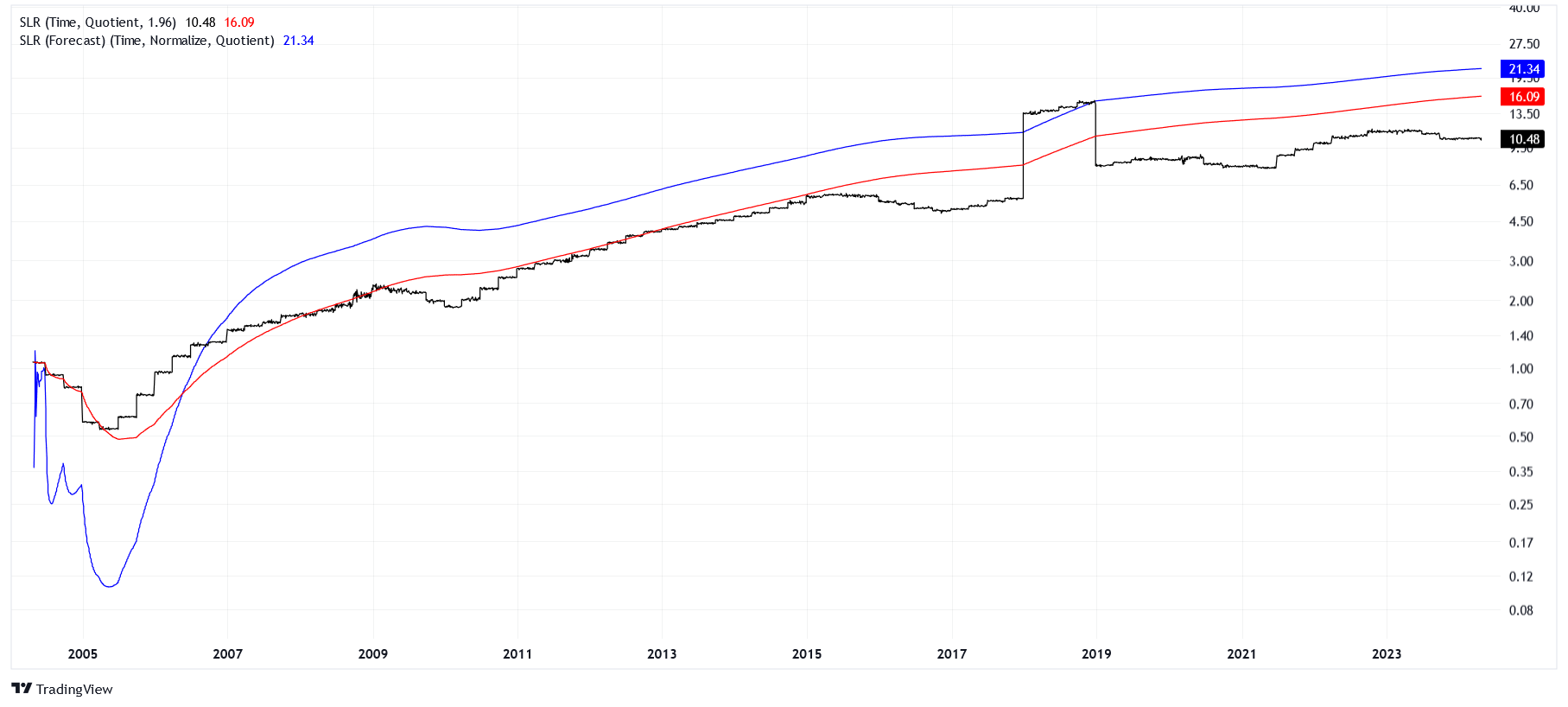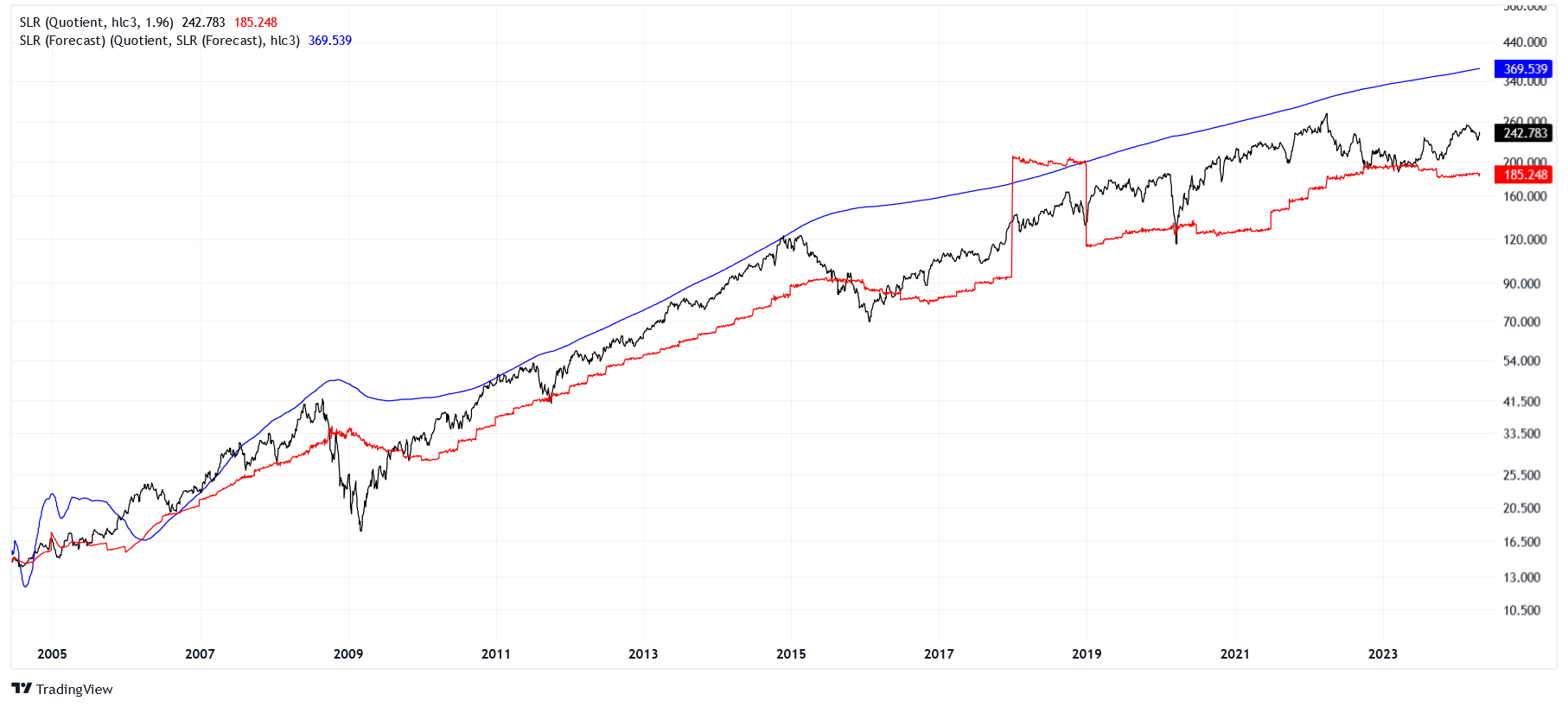 Notice that the actual price tends to follow the red line, which predicts price using the current EPS. However, there are deviations where the price more closely resembles the blue line. What does this mean? There are times at which the market is willing to pay for earnings it expects to receive in the future. Essentially, the market is getting ahead of itself, trying to front-run earnings projections. This is actually quite rational if the majority of market participants believe it to be rational.