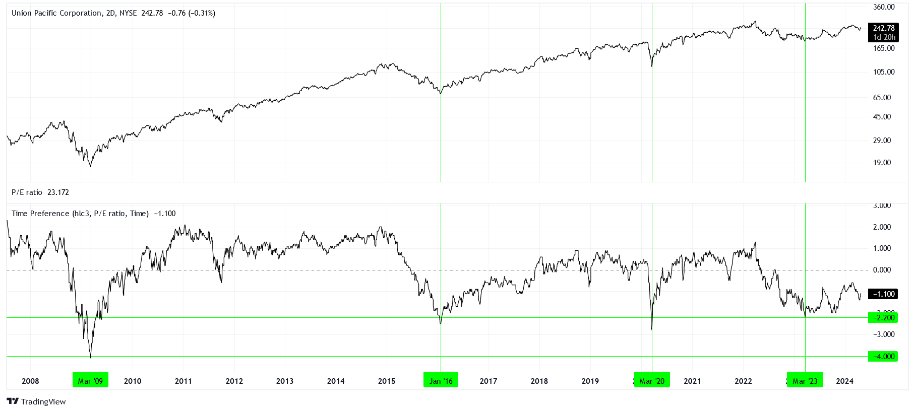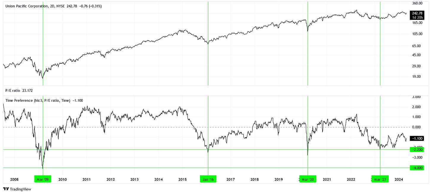 Let’s take March 2009 as a case study. The time preference for UNP was as low as -4. What does this mean? At the time, the market was willing to pay for UNP what it could have expected from the relationship between income and price four years prior. In other words, a four-year discount on the expected EPS.