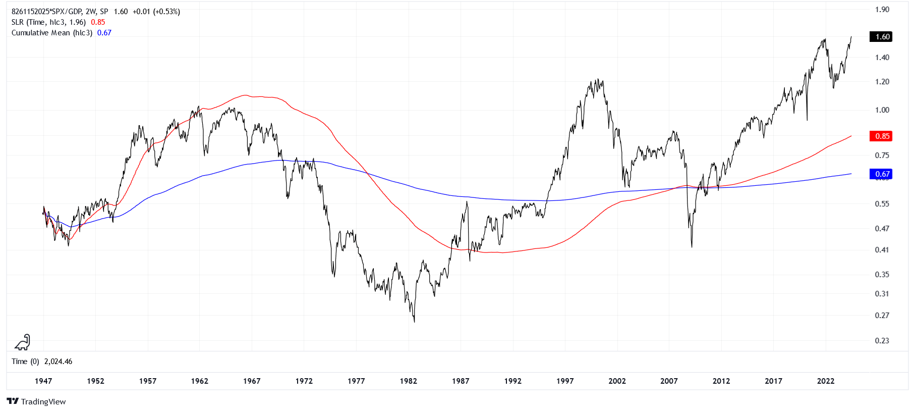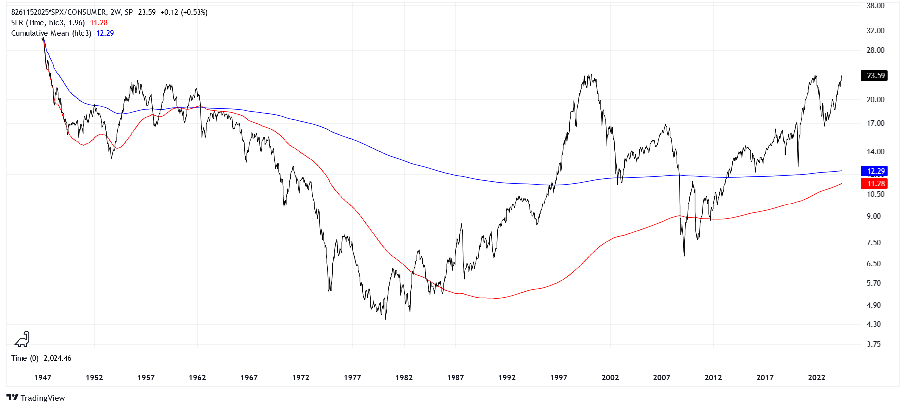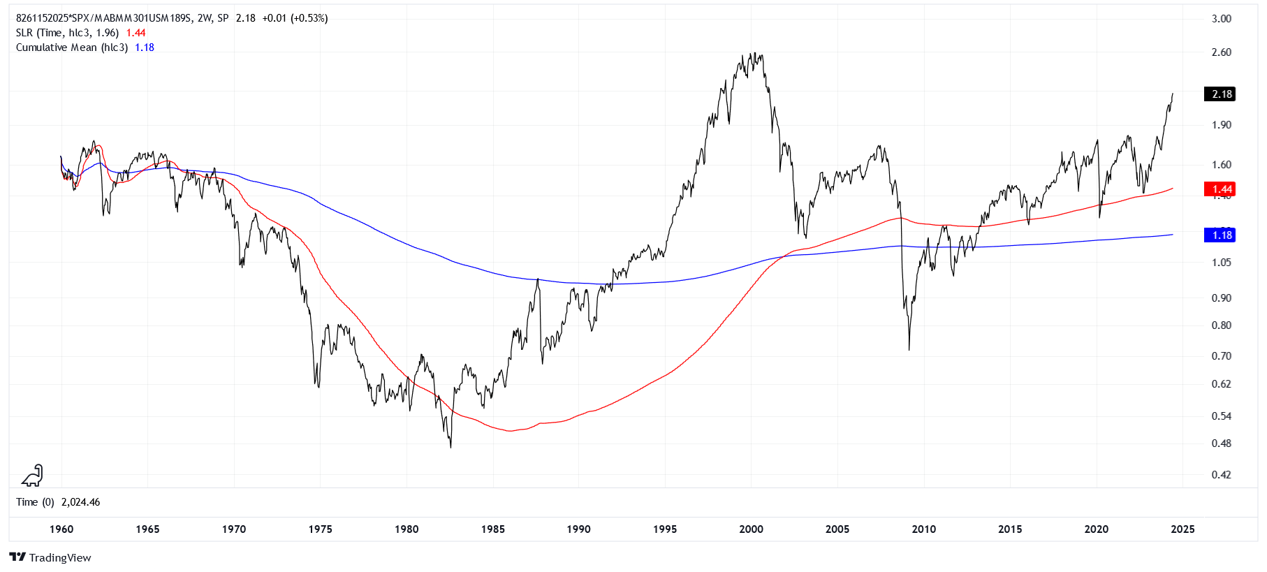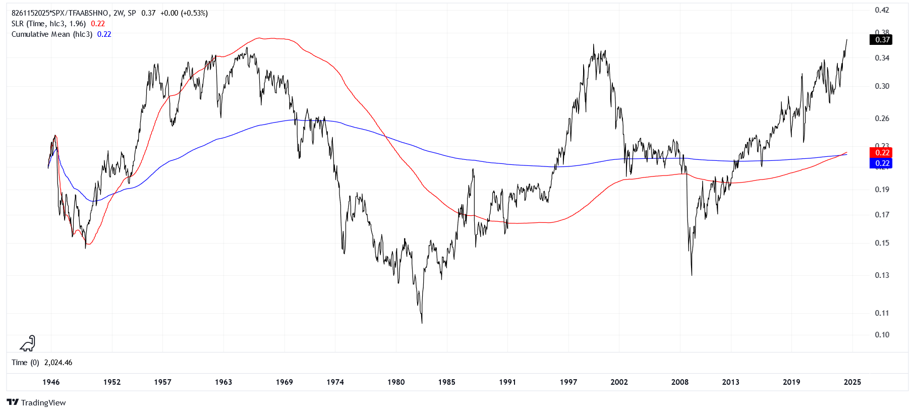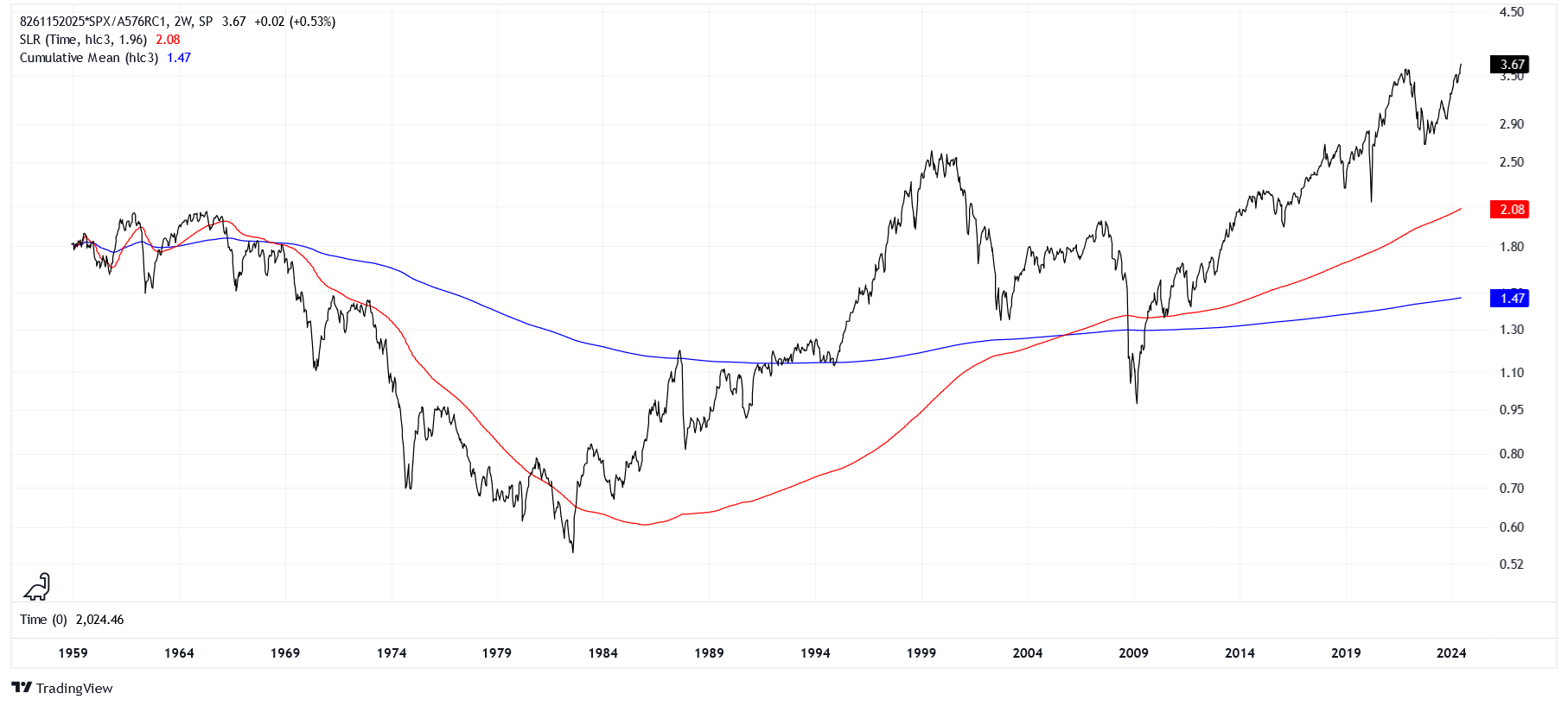 Hopefully, you understand the routine by now. We pull up a spread between the SPX and some relevant series that we can price it against, add a couple trendlines for context, and go from there.