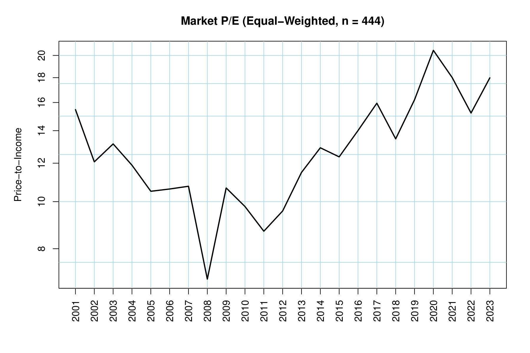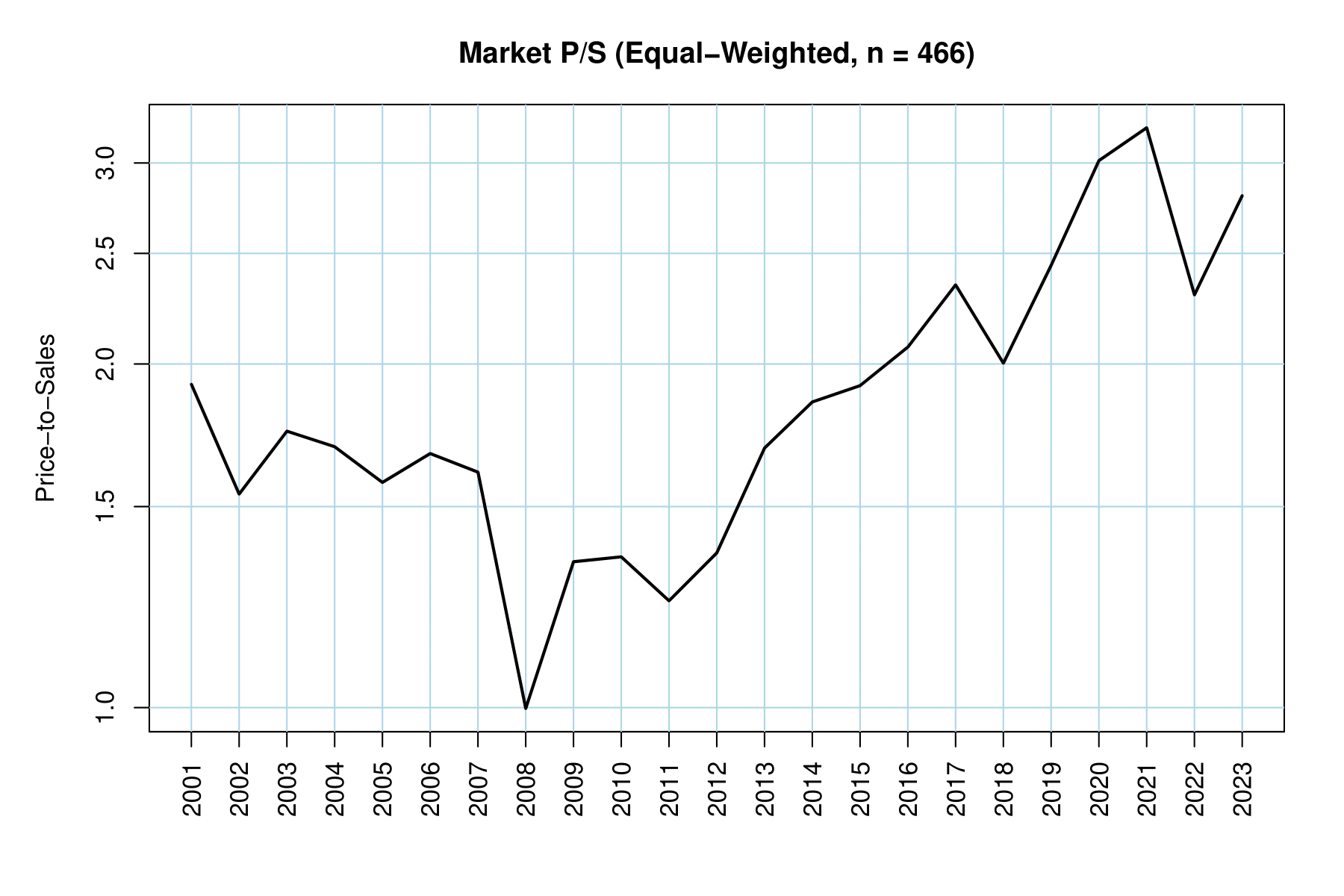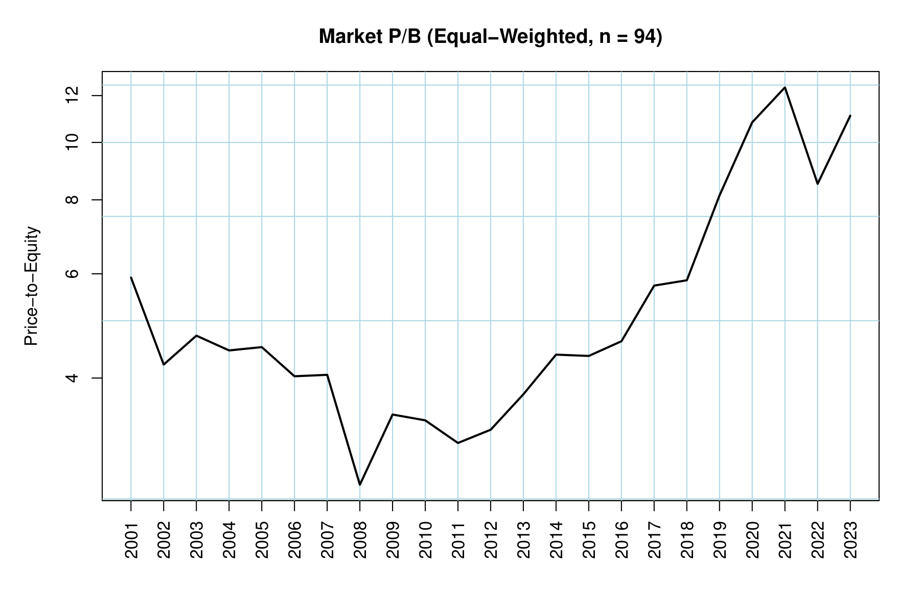 Do note that we have much less data for this ratio. Only 94 of the 500 companies we scraped have complete data from 2001 to 2023. While this number is still large enough to be considered an acceptable sample, we could be leaving out mega-caps that have a bigger effect on the ratio.