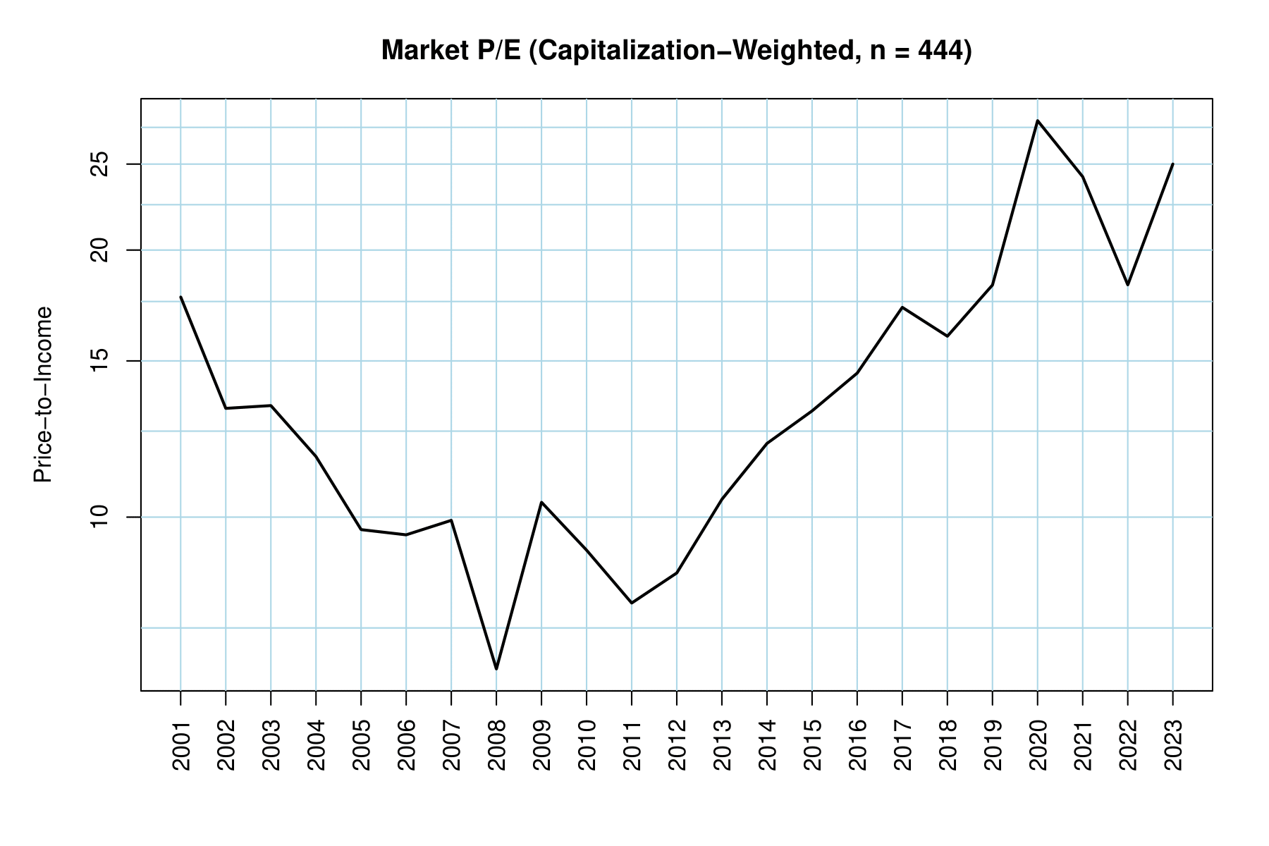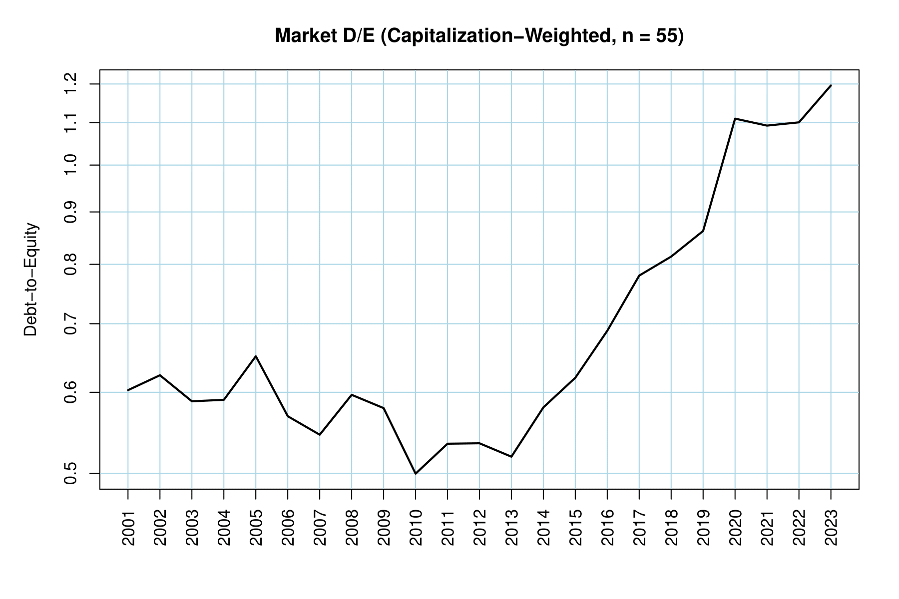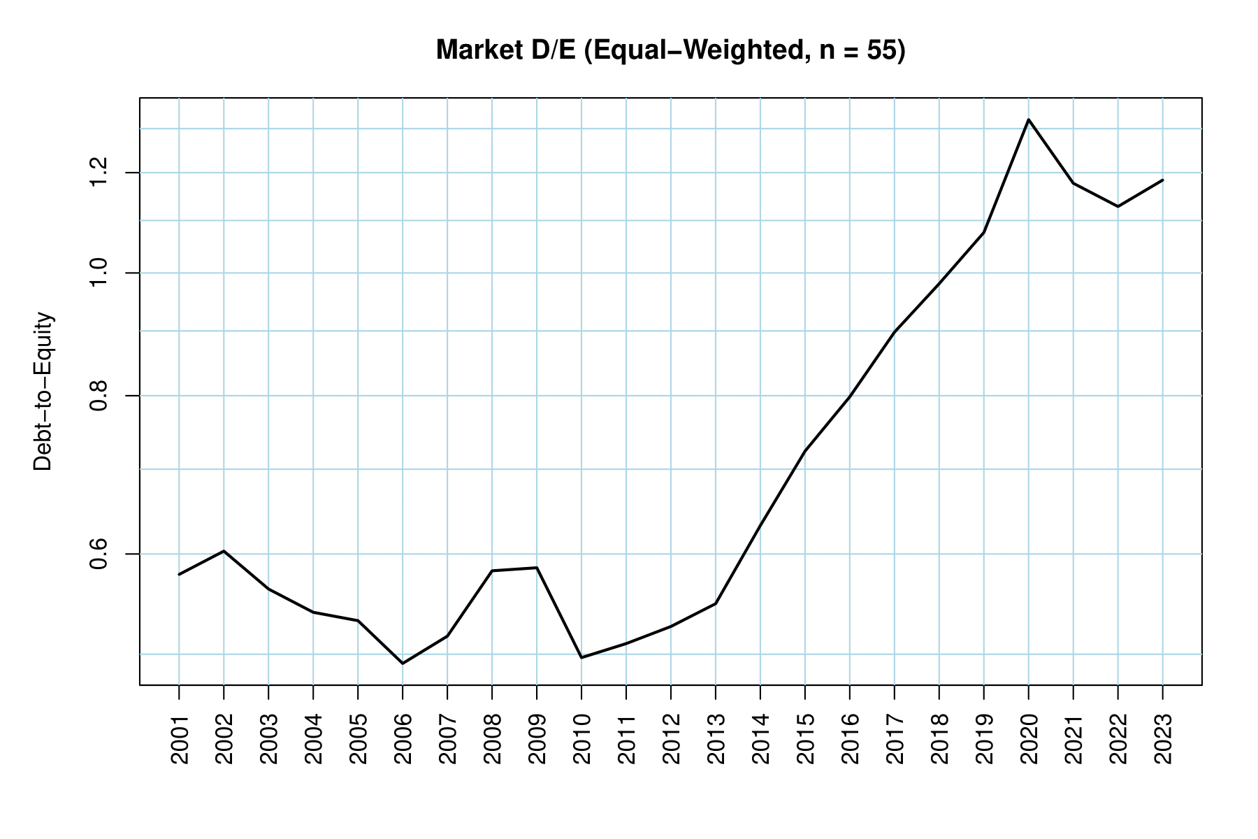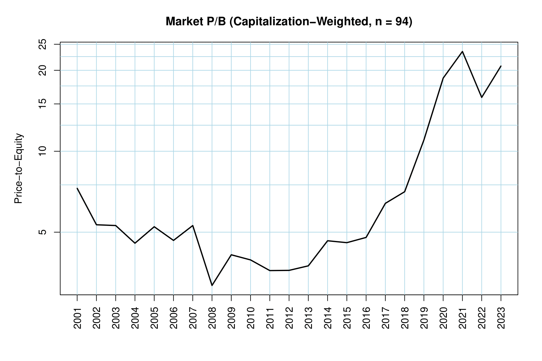 Do note that we have much less data for this ratio. Only 94 of the 500 companies we scraped have complete data from 2001 to 2023. While this number is still large enough to be considered an acceptable sample, we could be leaving out mega-caps that have a bigger effect on the ratio.