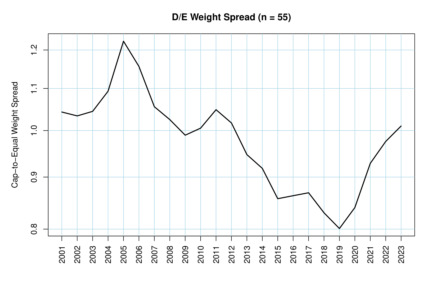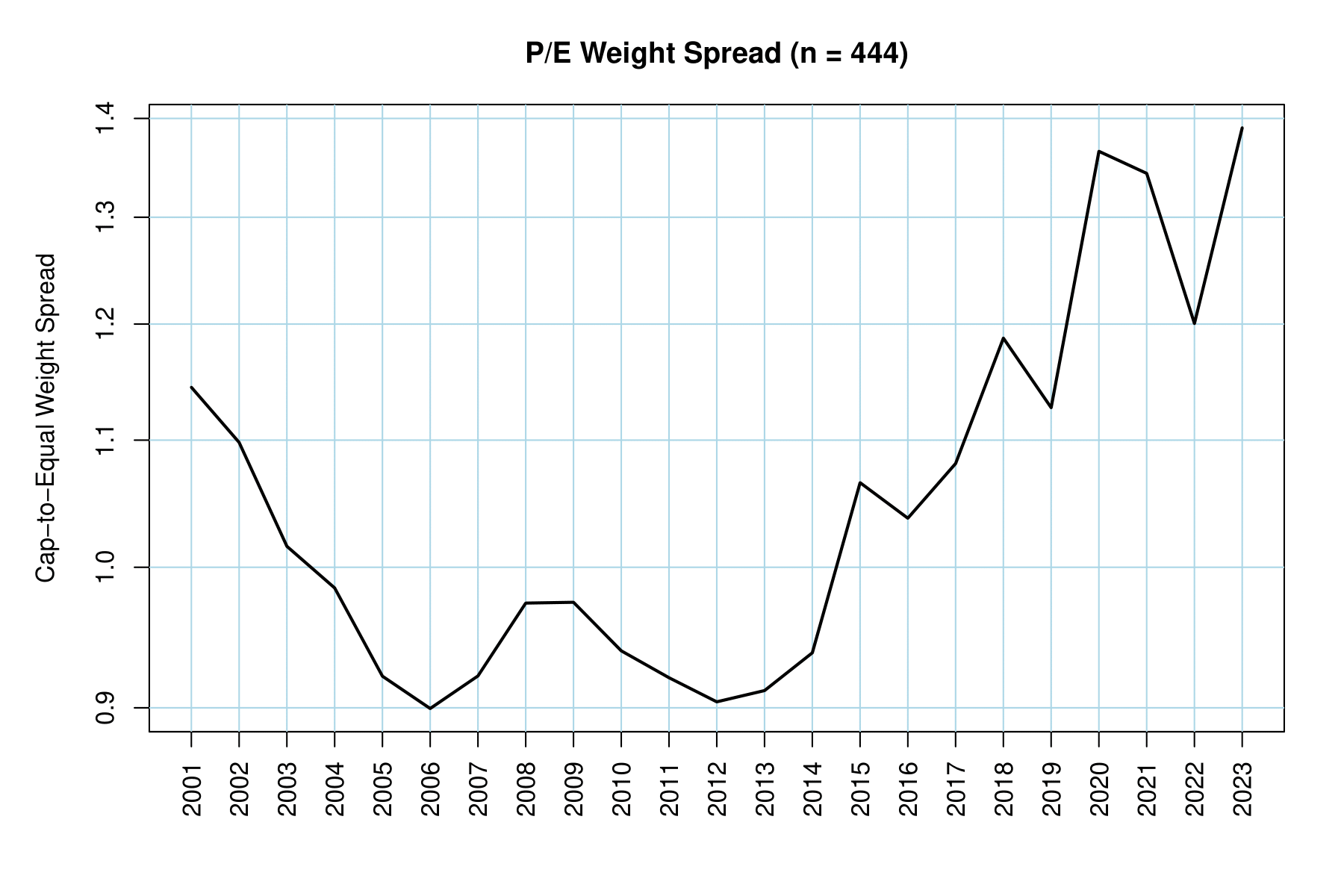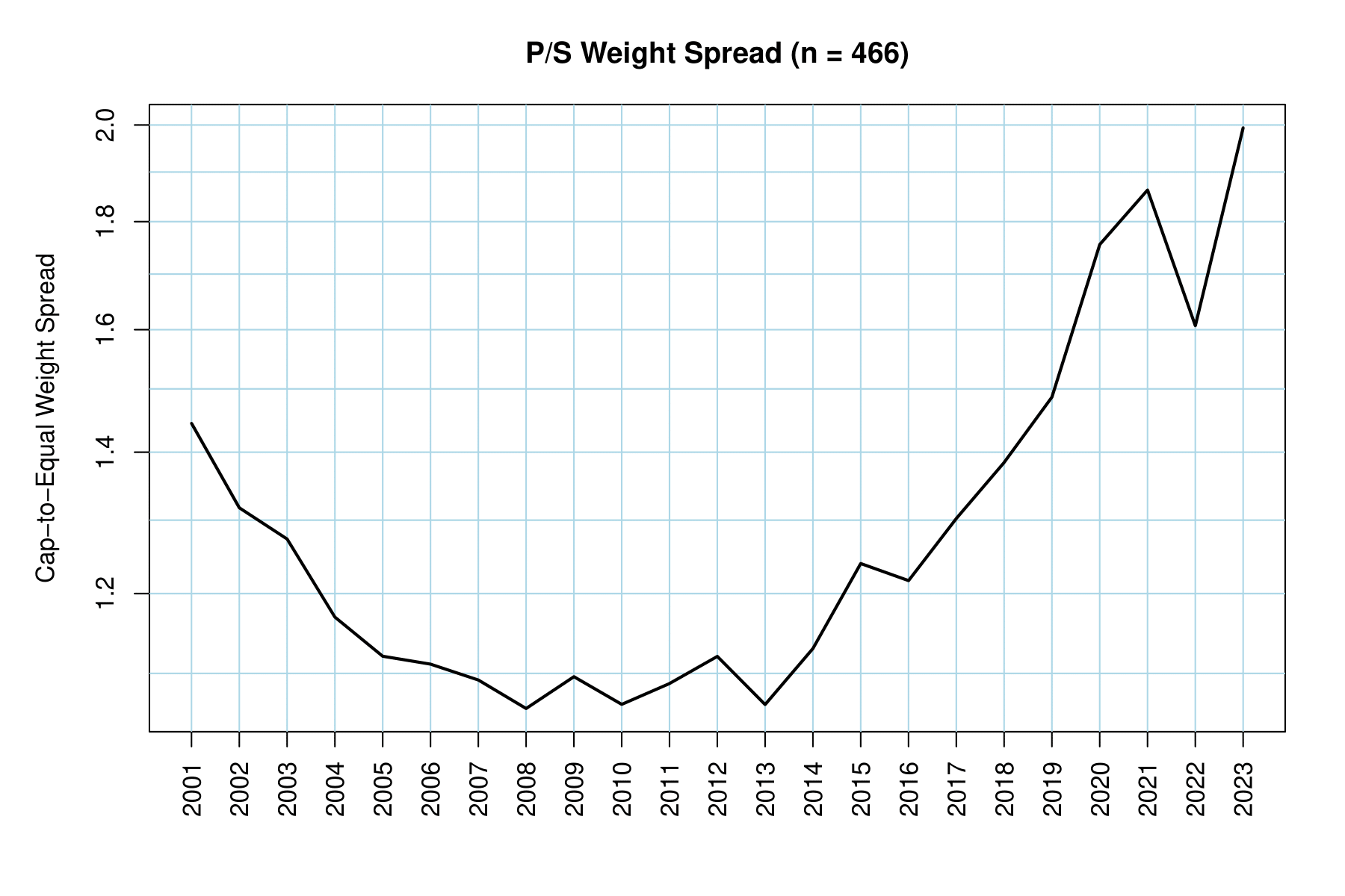 To better parse out the difference between the weighing methods above, we can simply take their spread (quotient). We will compare the cap-weighted sales multiples over the equal-weighted sales multiples in the chart below.