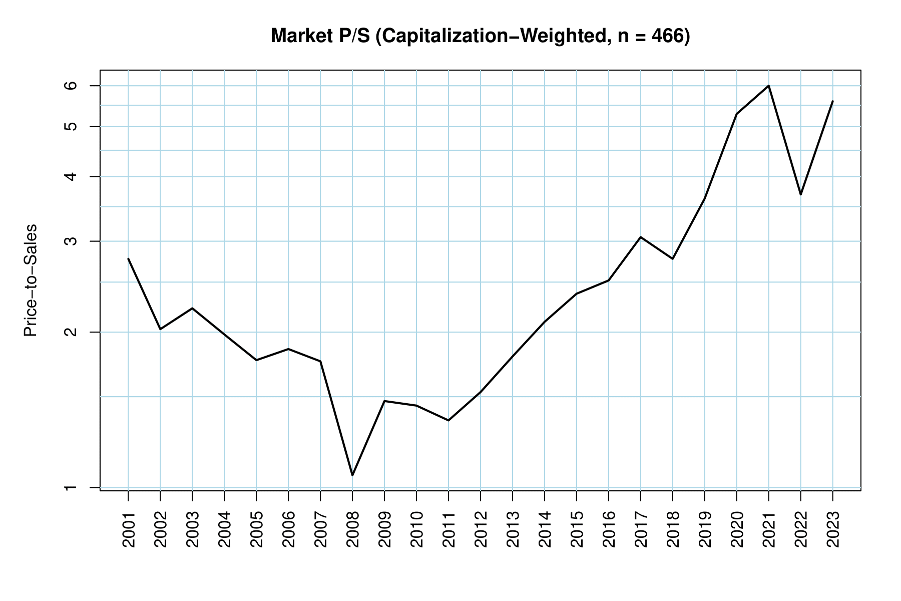 This makes it abundantly clear that mega-cap and large-cap stocks are becoming more expensive at an accelerated pace compared to the “typical” stock. In fact, the sales multiple for the cap-weighted ratio has outpaced the equal-weighted ratio by about 82% between 2009 and 2023. Remember, this is an outpacing. It could be that the equal-weighted ratio is already expensive, but the cap-weighted ratio is that much more expensive!