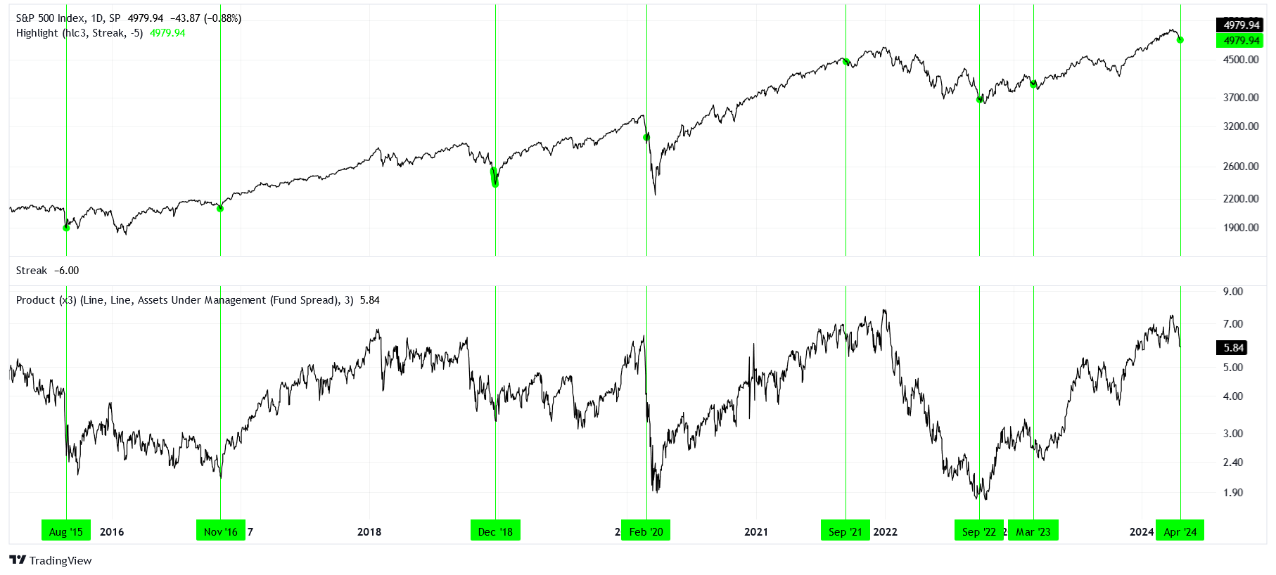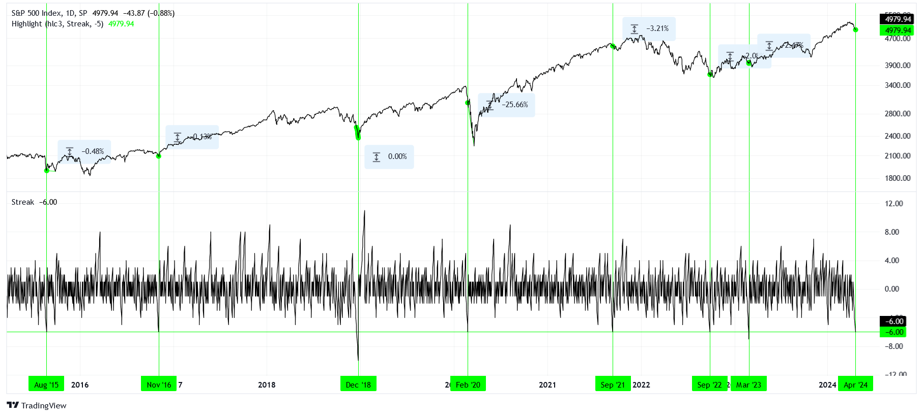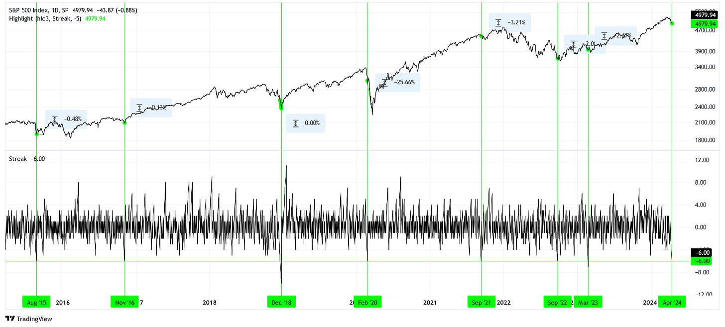 First, let’s simply look at the S&P 500 cash index (SPX) and an indicator that tells us either the positive or negative streak of daily price changes. It’s currently reading six down days in a row.