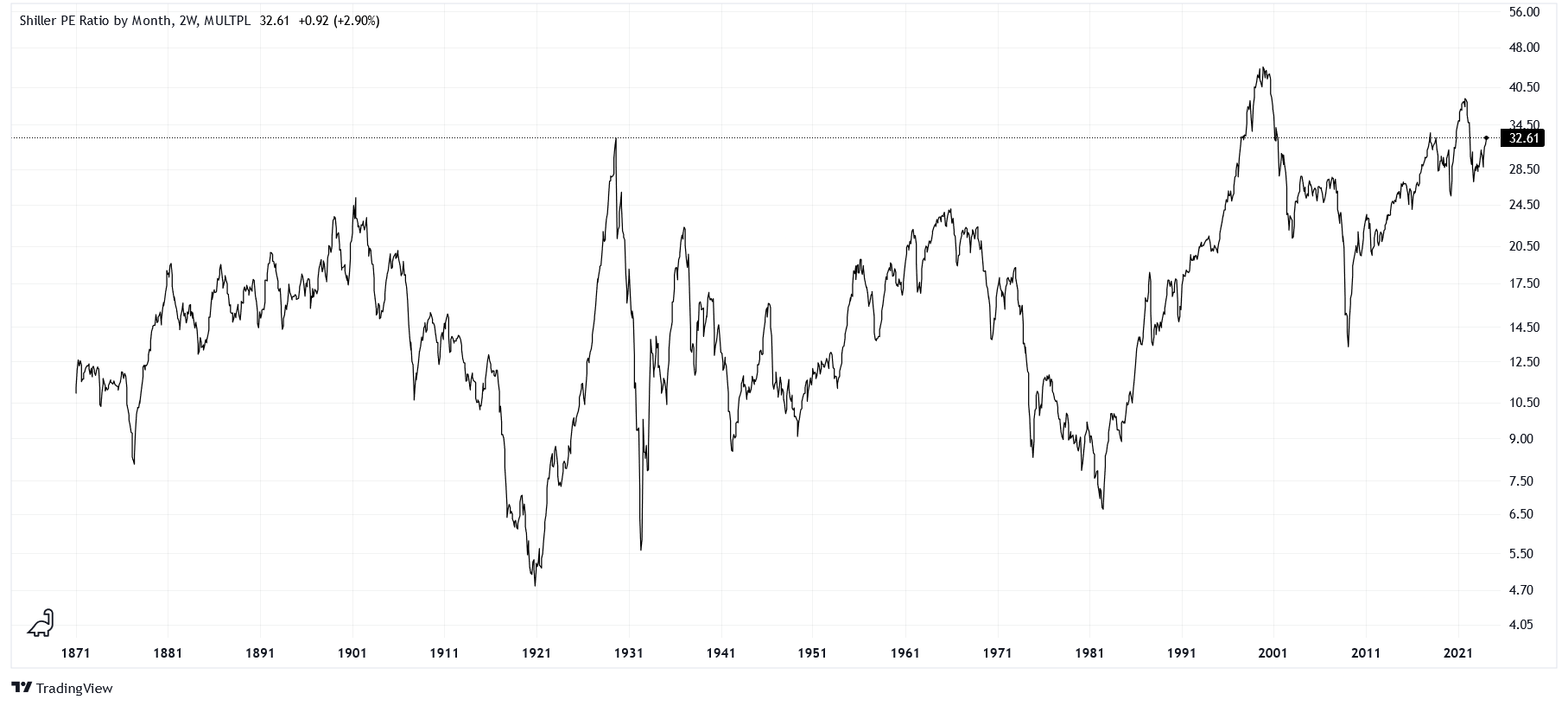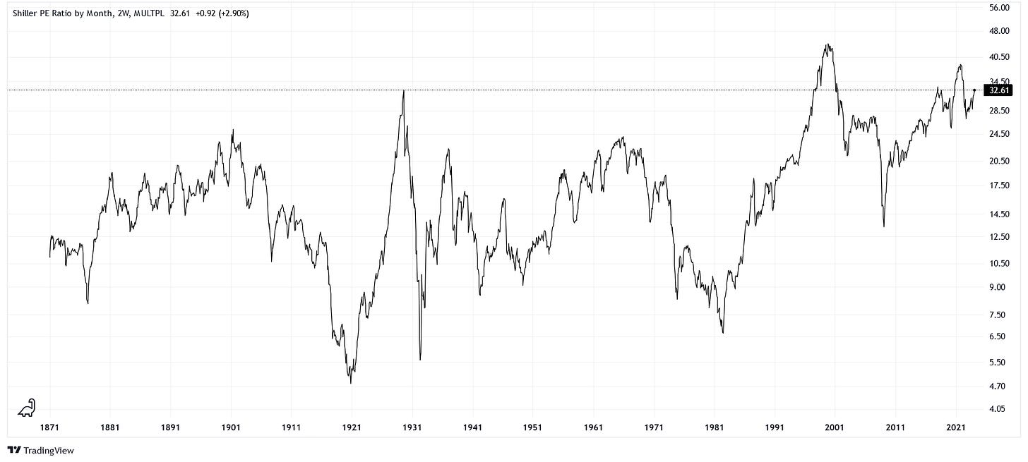 Robert Shiller is a highly influential American economist. One of his most famous series, the cyclically-adjusted P/E ratio (CAPE), normalizes the P/E ratio of the S&P 500 index for inflation over 10-year periods. Its current value reads 32.6, meaning that the capitalization (price) of the market is 32.6 times larger than its total earnings (net income). One way to rationalize this value is to consider that it would take 32.6 years of earnings to "pay off" the current capitalization.