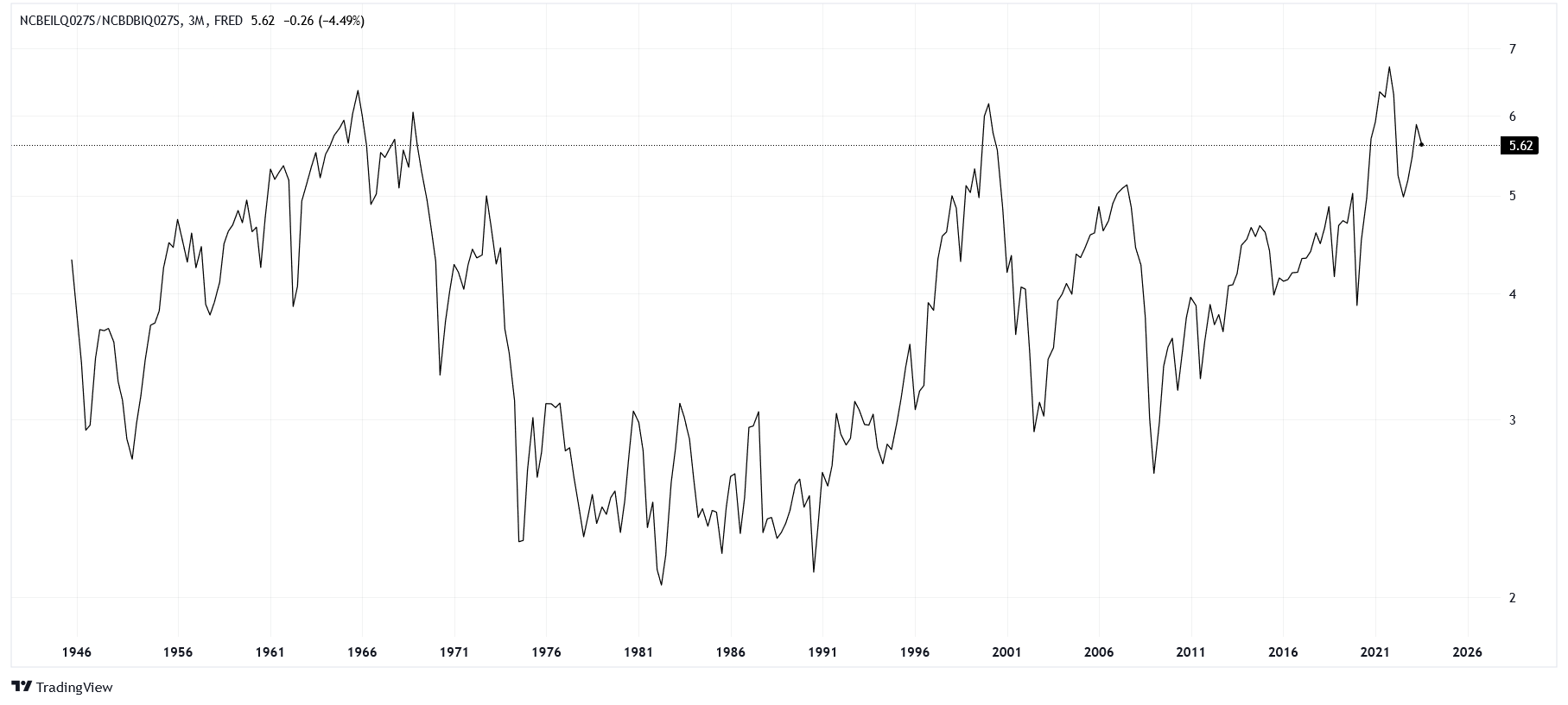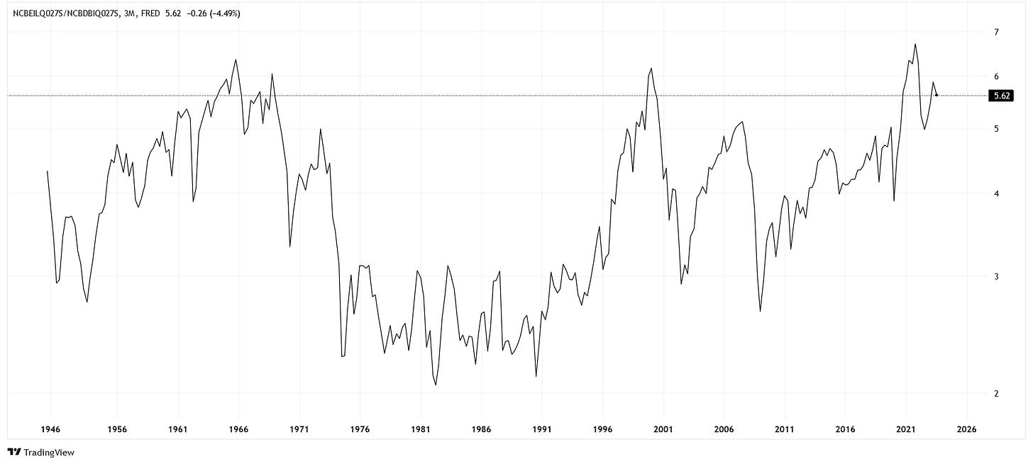 Finally, we can run a similar spread for corporations. We will take the ratio between "Nonfinancial Corporate Business; Corporate Equities" and "Nonfinancial Corporate Business; Debt Securities." Currently, even businesses can feel cozy looking at their stock portfolios!