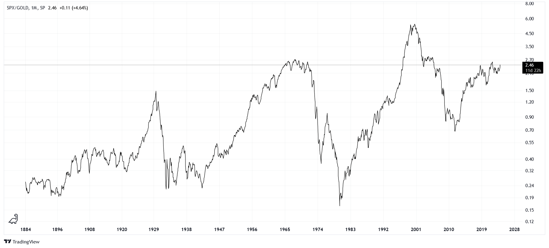 If we take the spread of the S&P 500 cash index (SPX) and the price of an ounce of gold, we are no longer pricing the market in dollars but in ounces of gold. It is important to note that the price of gold was fixed in the United States before the 1970s, hence the dramatic plunge in our spread around that period.