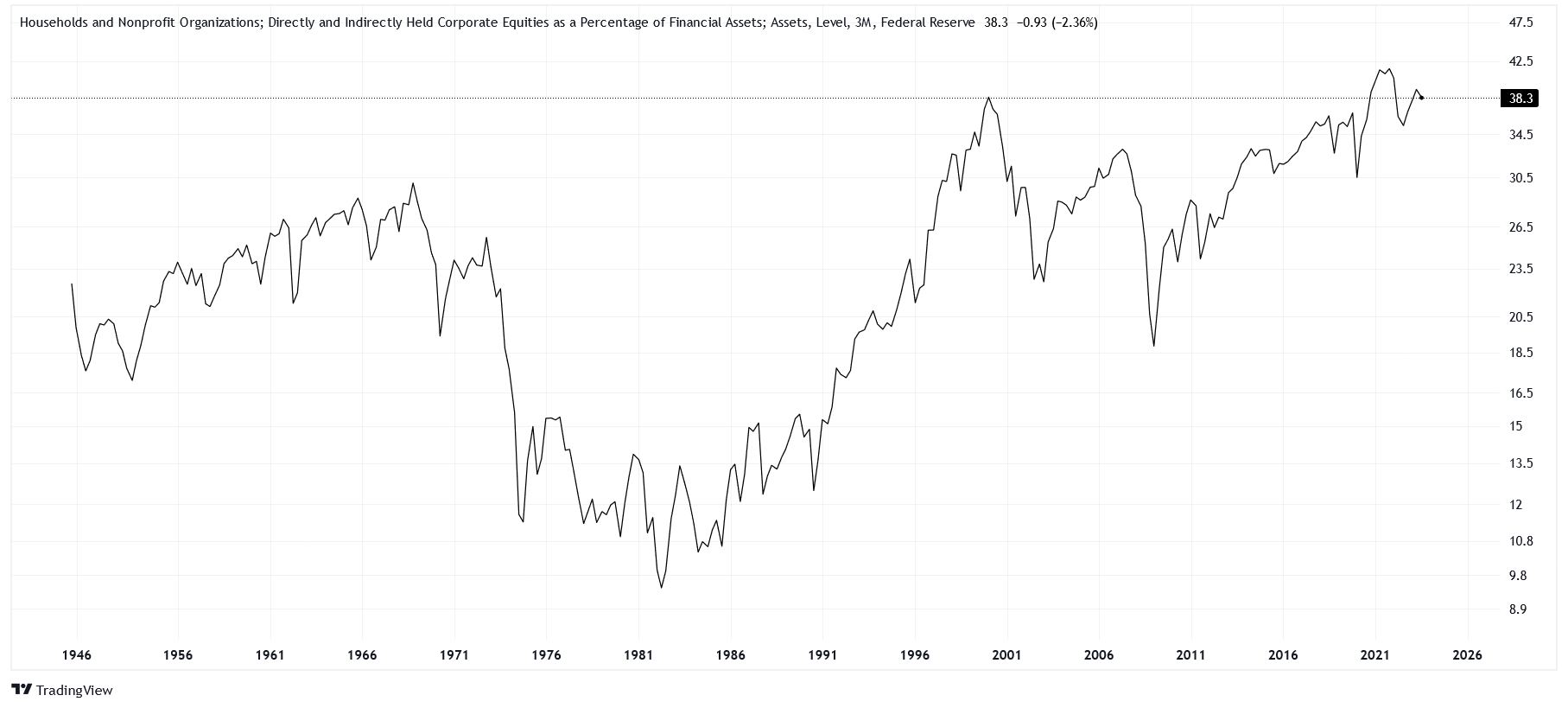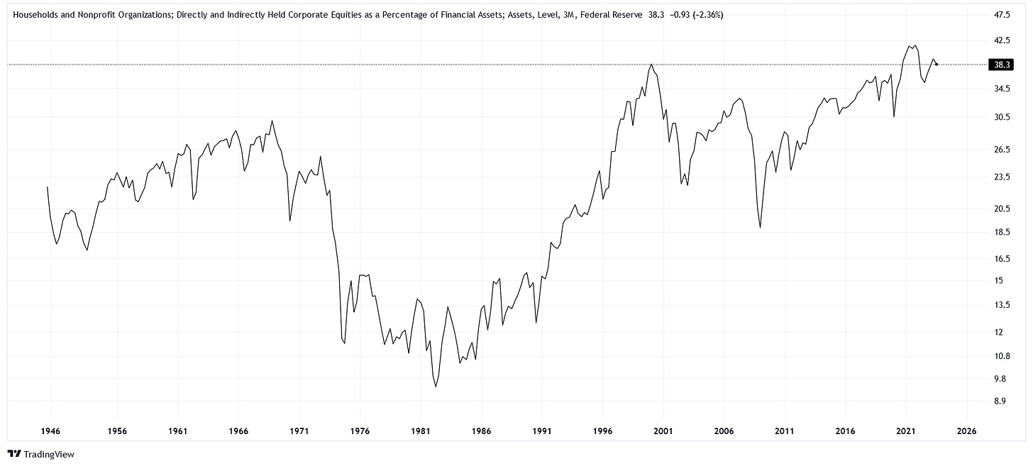 The variable we are looking at is something of a unicorn. Provided by the Federal Reserve, its full title is "Households and Nonprofit Organizations; Directly and Indirectly Held Corporate Equities as a Percentage of Financial Assets." Currently, this measure tells us that for all the financial assets that households and nonprofits hold, 38.3% of their value comes from equities. Besides 2021, the only time we had a similar reading was during the Dotcom bubble.