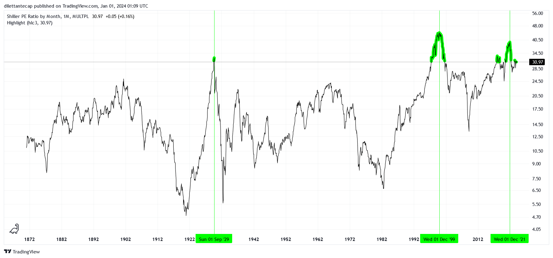 The Shiller P/E ratio of the S&P 500 currently sits very close to 31, where it has been since 2017 (with minor deviations). Just to elucidate how expensive this is, we are near the 95th percentile going back to 1871. The two other periods of time with such elevated valuations were 1929 and 1997-2002. You have probably heard of the Great Depression and the Dotcom bubble. These were not good investment opportunities, to say the least.