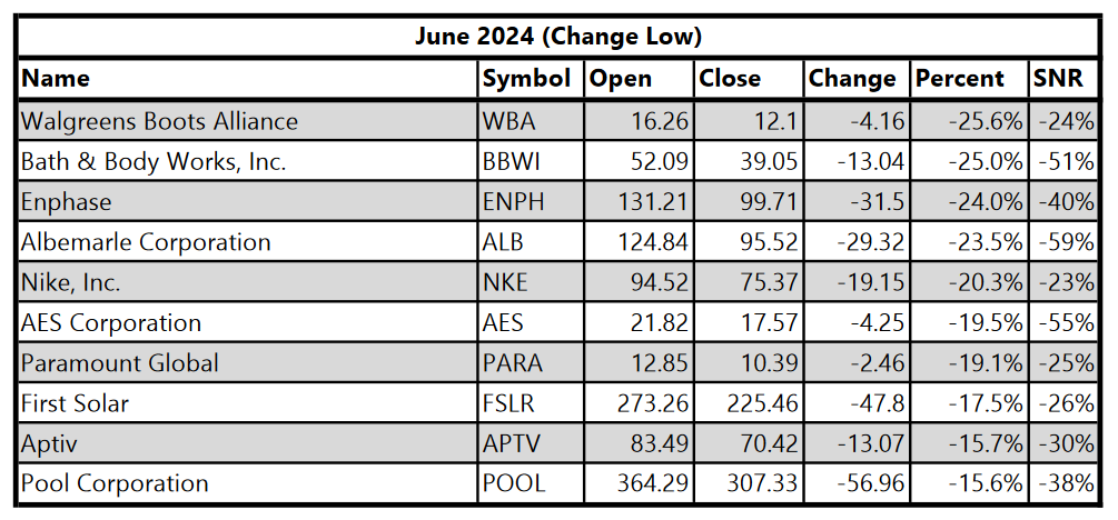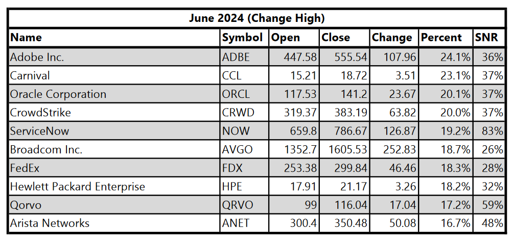 While SNR is a personal favorite measure, I realize that percent change is just as powerful of a measure, it really depends on the context. So, let’s look at the best performing stocks for June while we’re at it!