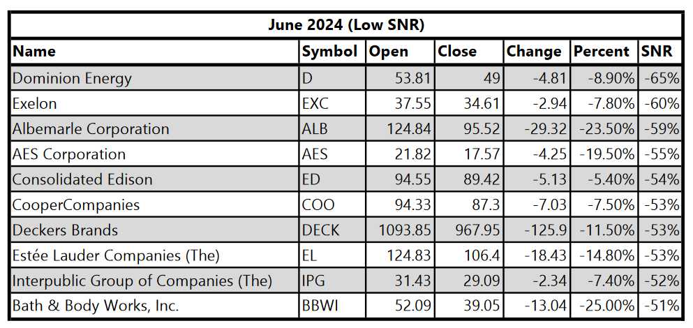 Starting with the lowest SNR stocks for June, we see some utilities and material stocks at the top of the list.