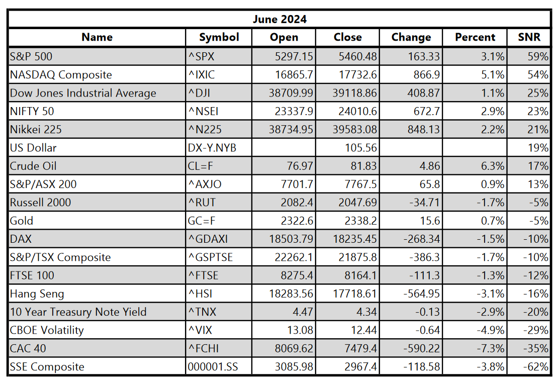 American equity indexes came in strong once again, with the S&P 500, Nasdaq Composite, and Dow Jones Industrial Average composing the top three assets according to their signal-to-noise ratios (SNRs). Notably, the percentage change of these assets were more muted than in May.