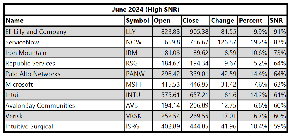 For July, we have expanded our automated scraping process to the S&P 500 instead of the Nasdaq-100. Out of these supposed 500 companies (actually 503 currently), here are the best performers for June 2024, ranked by their SNR.