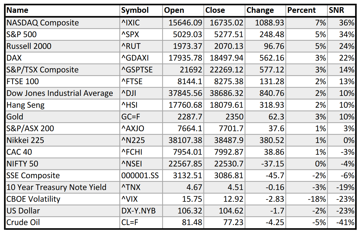 The American equity indexes took the lead with the Nasdaq, S&P 500, and Russell 2000 all up by at least +5%. Around the world, equities generally performed well. Some exceptions might be China’s SSE Composite index coming in at around -2% and the NIFTY 50 of India remaining flat.