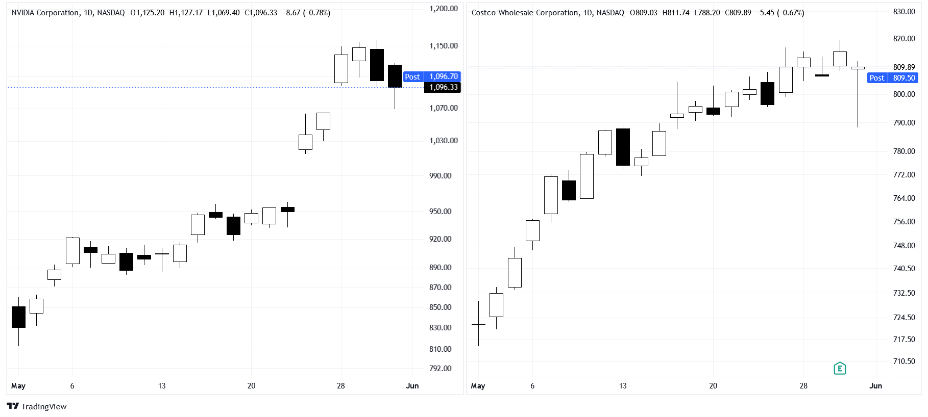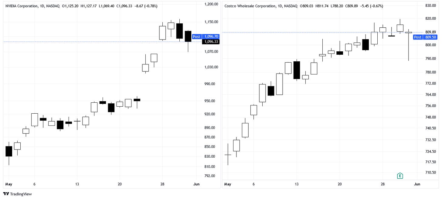 For example, Costco’s (COST) +12.1% increase is clearly smaller than NVDA’s, but the ride was much smoother. This is also important! We not only want to make a profit, but we want to be comfortable doing so. The tradeoff between performance and volatility is a personal tolerance, there is no “best” option. If you don’t want to risk losing any principal, you can consider bonds. If you don’t want to risk losing additional performance, you can consider equities.