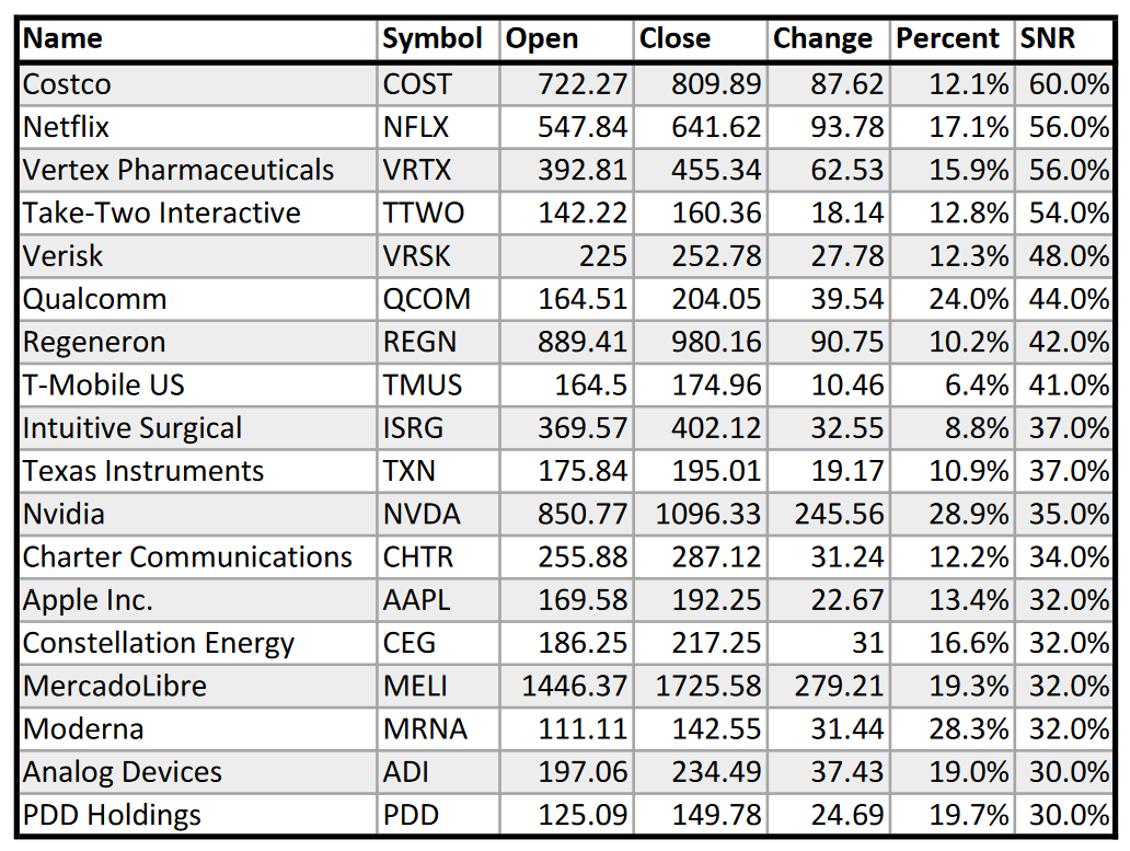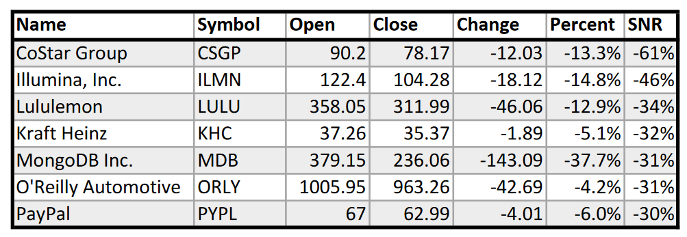 In sheer performance numbers, MongoDB (MDB) did the worst at -37.7%. In SNR numbers, CoStar Group (CSGP) did the worst at -0.61 SNR. Reporting the SNR in percentages is not really appropriate, but it’s too late now!