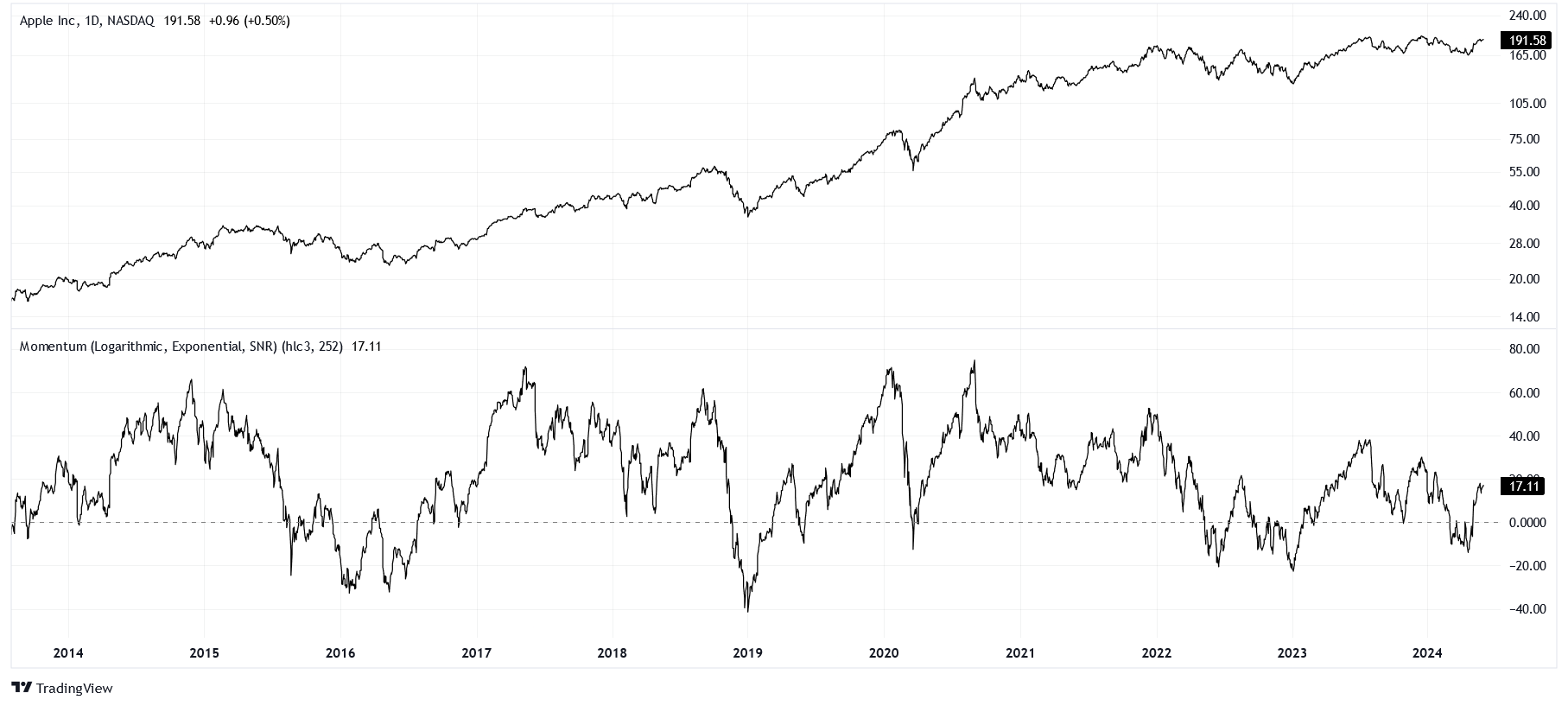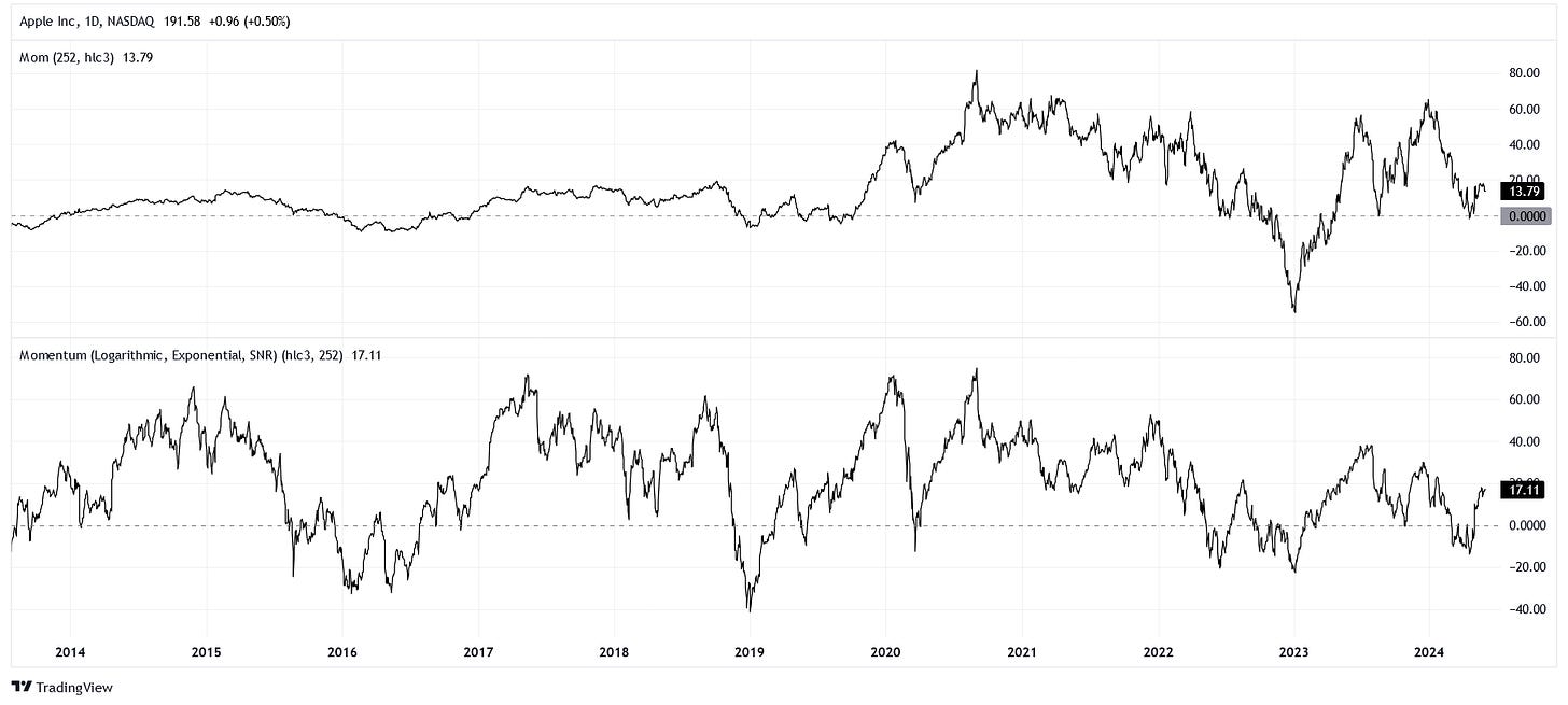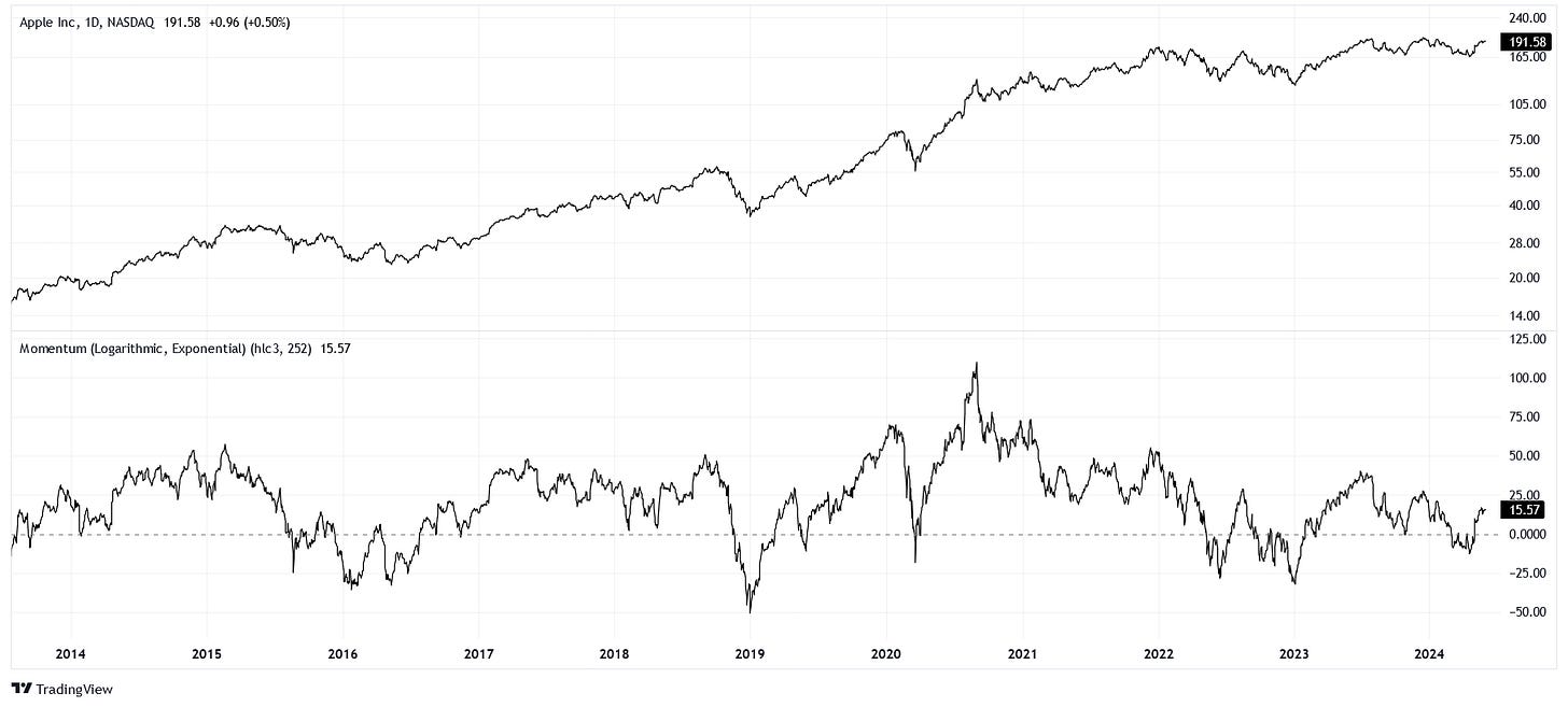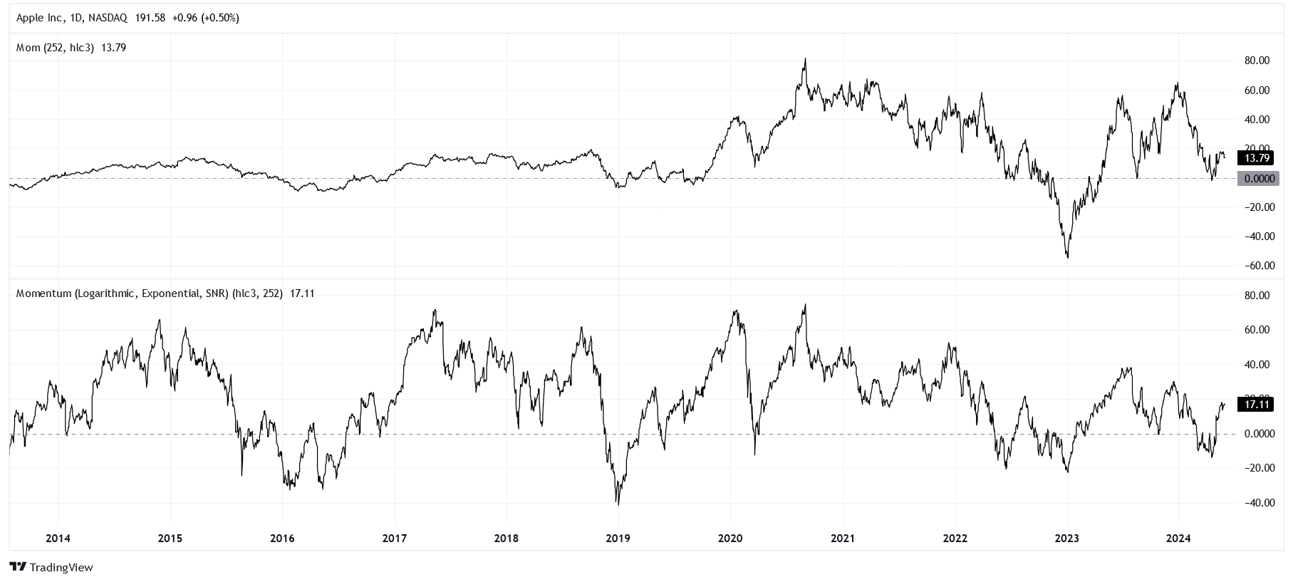 Notice that as time progresses, and the price of AAPL rises, the range of our momentum indicator is widening. This is the first mistake of the indicator; it doesn’t take into account the scale of price. What we prefer is a scale invariant indicator.