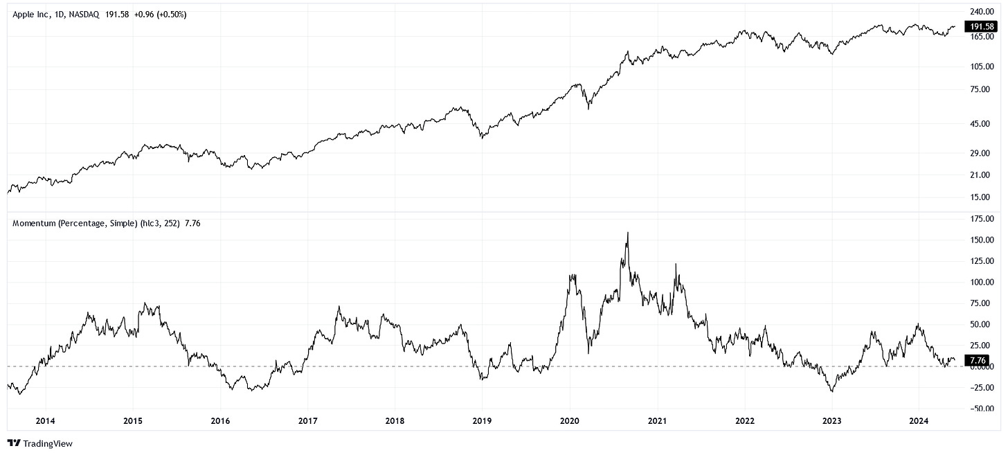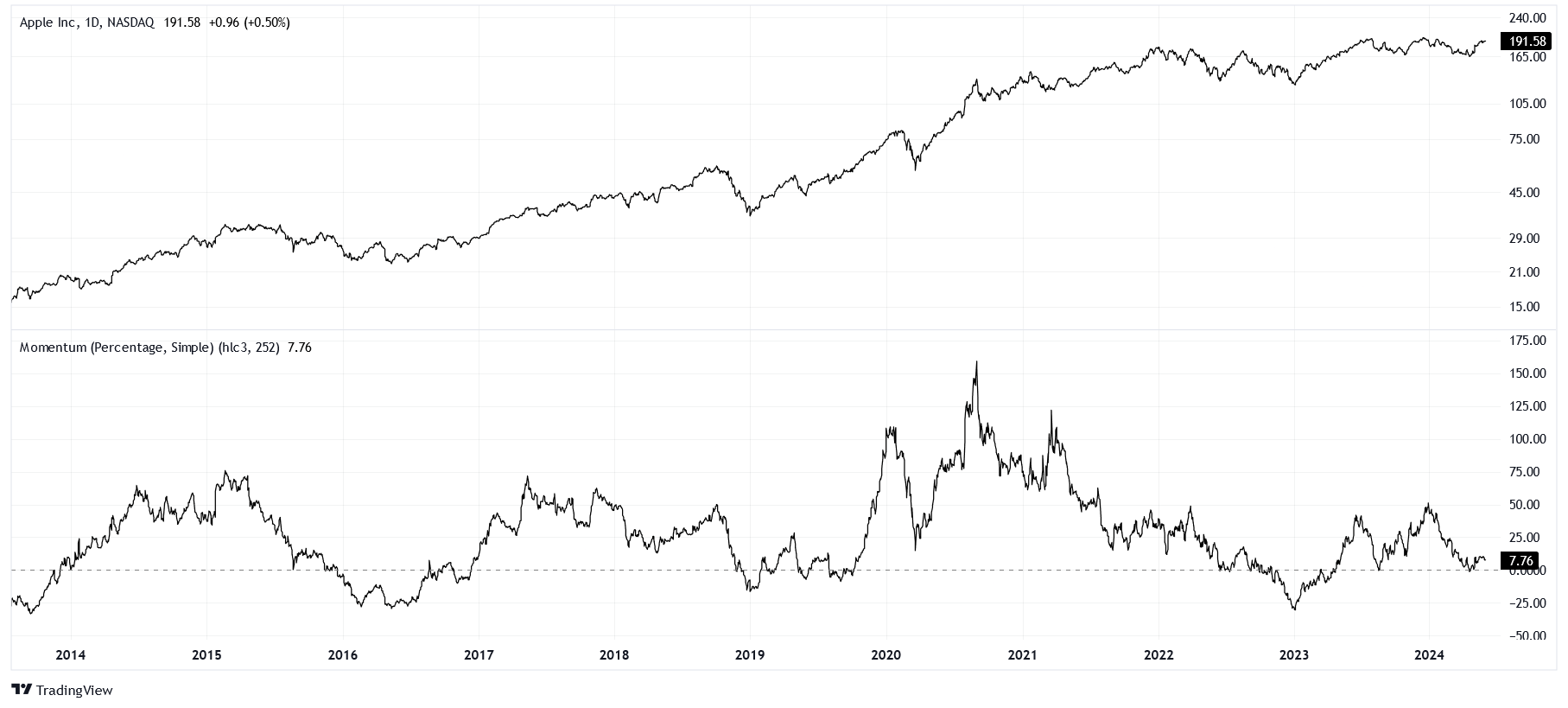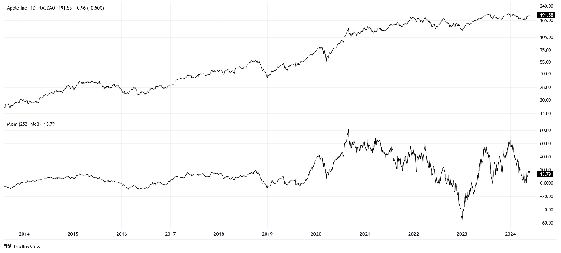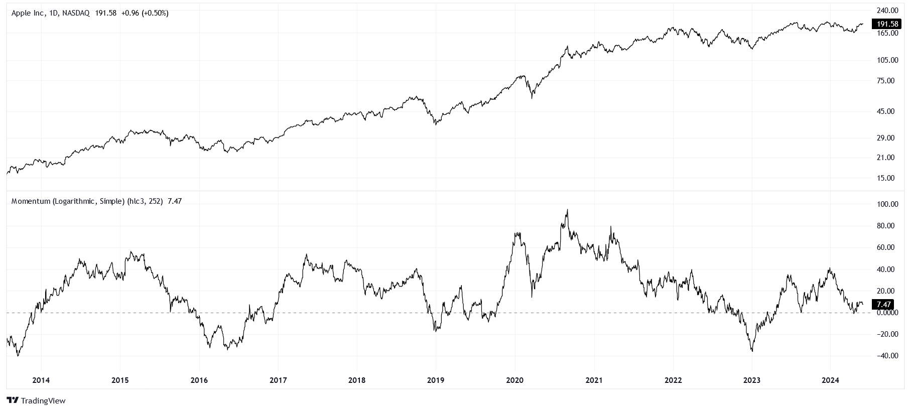 Notice that as time progresses, and the price of AAPL rises, the range of our momentum indicator is widening. This is the first mistake of the indicator; it doesn’t take into account the scale of price. What we prefer is a scale invariant indicator.