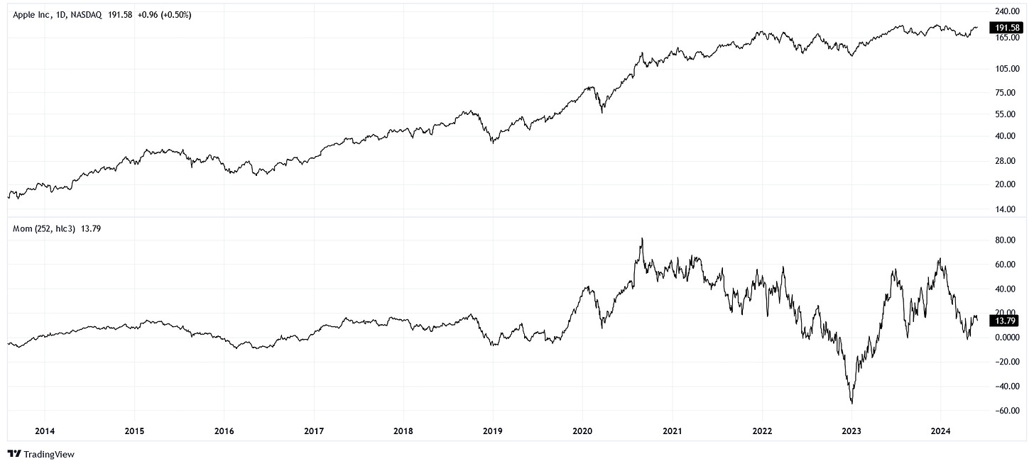 Say we have a length of 252, which is how many trading days there are in a year. If today’s close was $100 and the close 252 trading days ago was $90, then our momentum would read +10 for the current day.