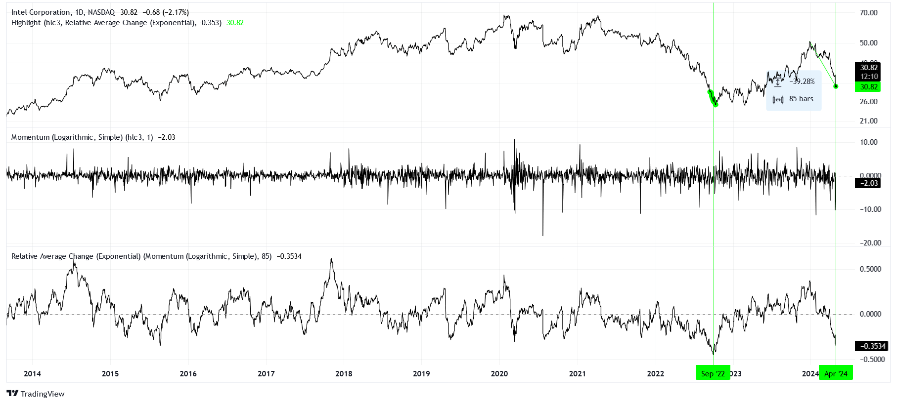 One chart that stuck out to me this month is Intel Corporation (INTC). In the past four months, it’s lost over 39% of its value. Using the same method as the section above, we can look for similar bearish periods in Intel’s history.