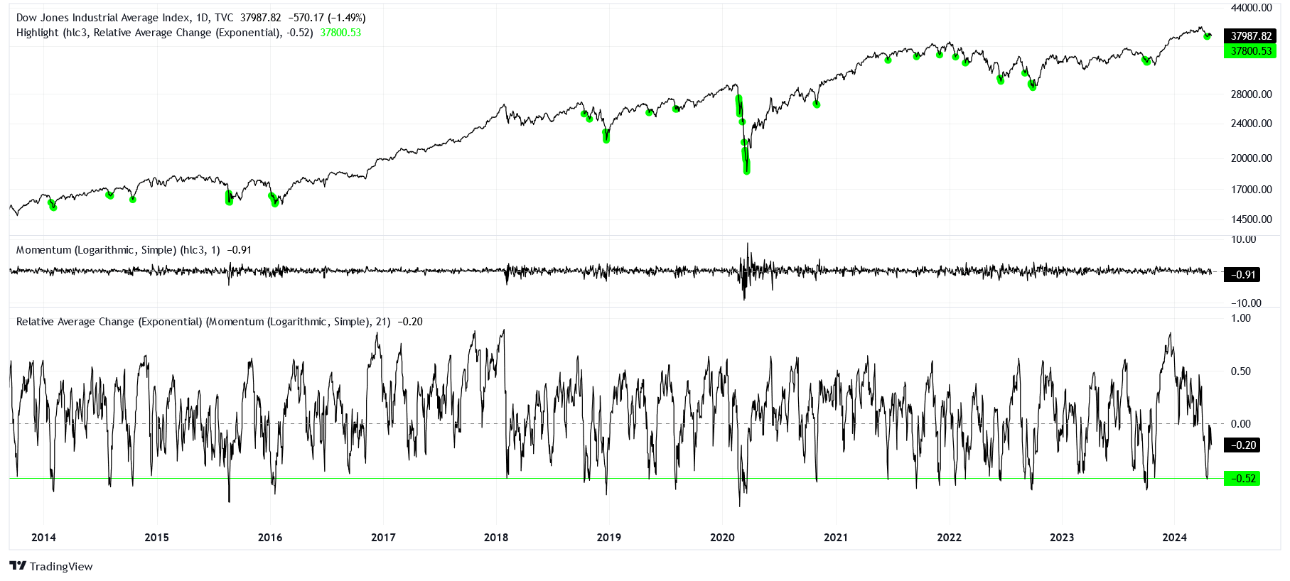 The DJI had a historically poor month. April 17th seems to be the worst day so far, based on a monthly exponential signal-to-noise ratio indicator (a reading of -0.52 means that 52% of the total movement was realized to the downside).
