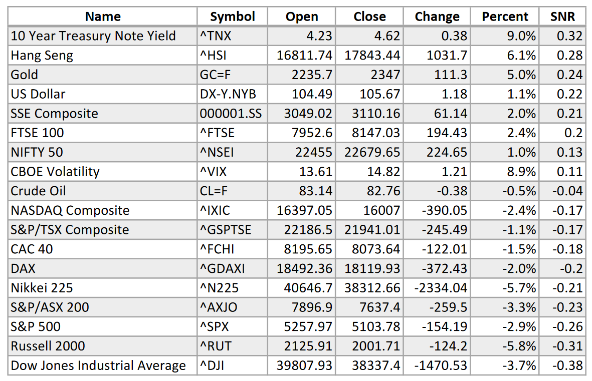The above data table is sorted by the signal-to-noise ratio calculated on daily log changes within April for each issue. This is not perfect, but it works reasonably well. Special attention should be given to issues that do not report in absolute values, like the 10-year Treasury note yield (TNX) and the CBOE volatility index (VIX). A percent change from a value that is already a percentage is not technically valid. We can be lazy for now and sweep those details under the rug.