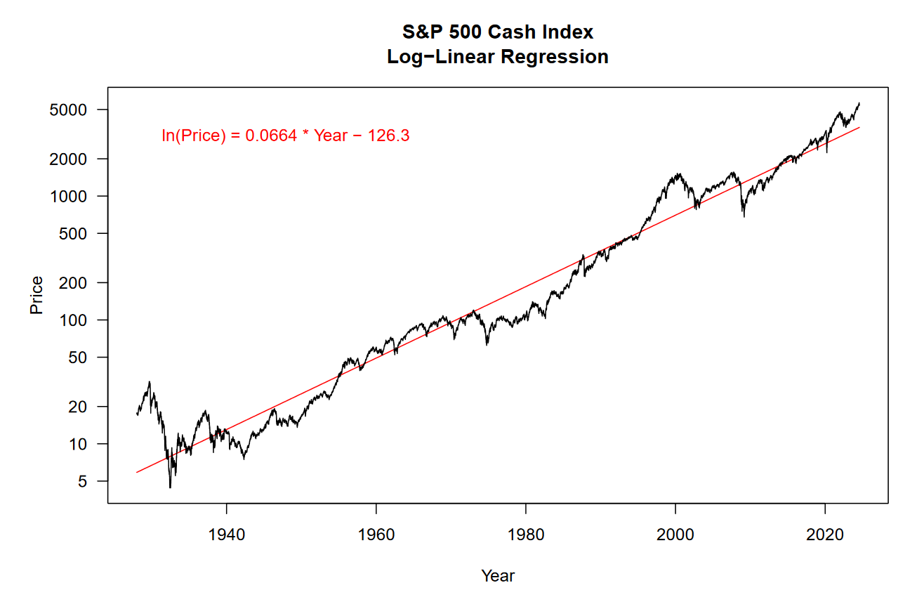 If you look at the y-axis, it’s apparent that this is not a linear scale. We are viewing the data on a log-scale, and this is the same scale that our model was fit on. Because compounding returns grow exponentially, we have to take the logarithm of price for its relationship to time to appear linear.