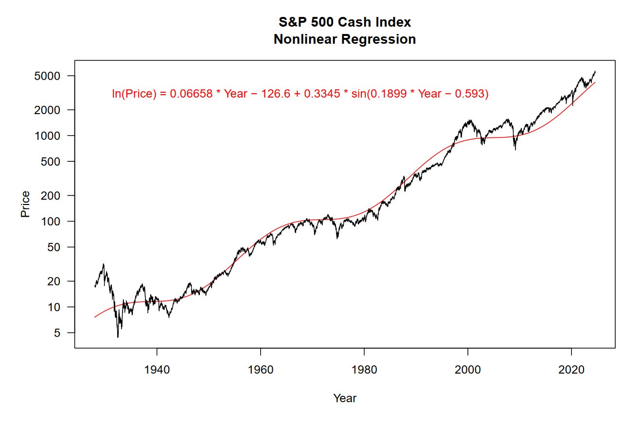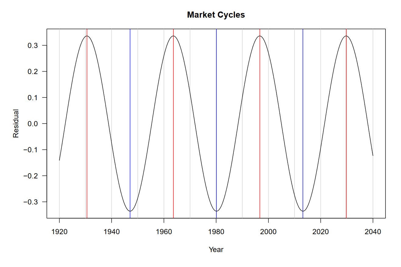 What if we were to look only at the sine wave component of our model? Perhaps it could tell us something about how the market cycles over a long timeframe.