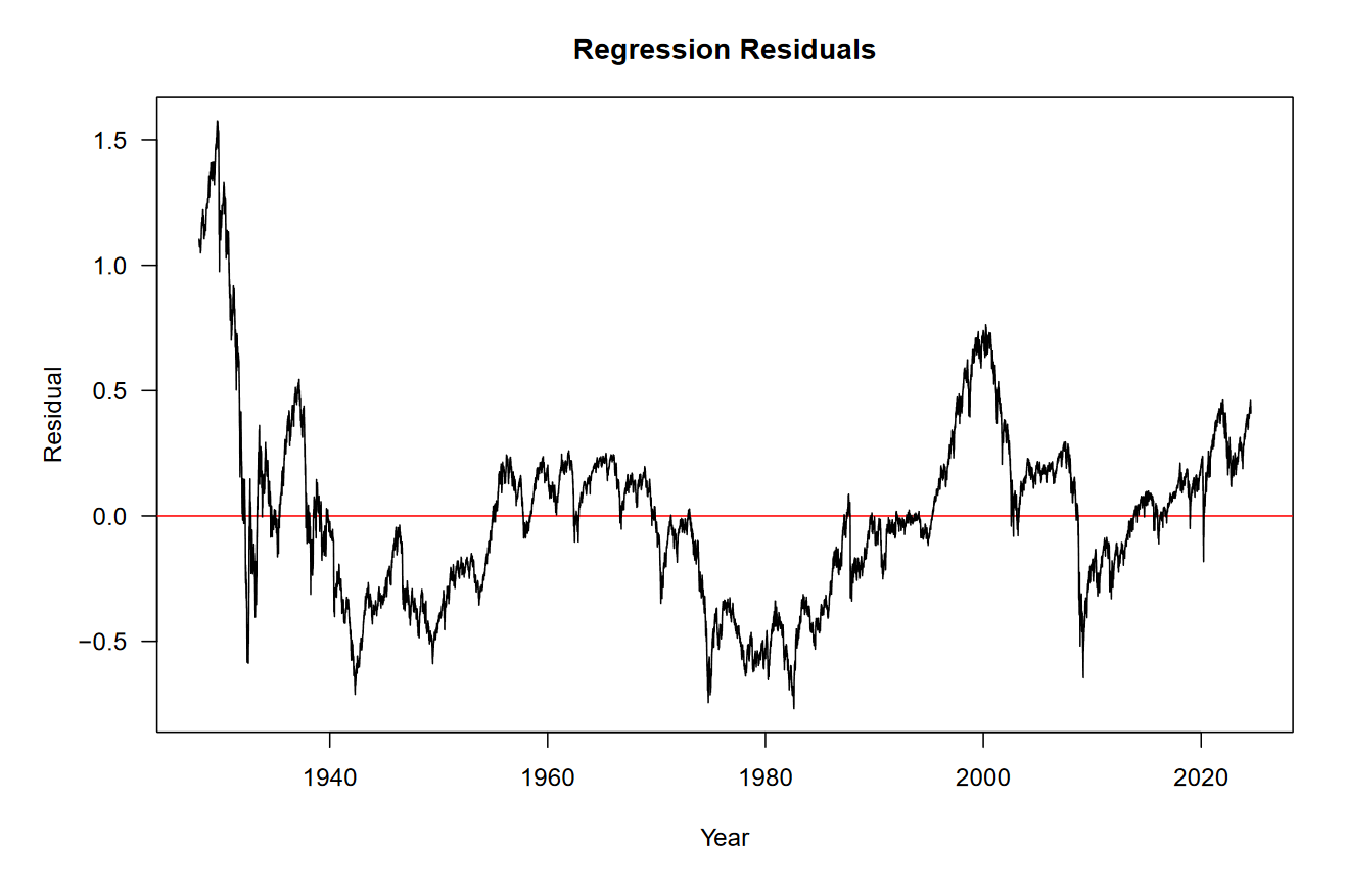 First, we will look at the coefficient of determination (also known as R², pronounced “R squared”). This is the squared correlation between our data and the model prediction. For the above model, we have an R² value of 96.22%, meaning that our model explains 96.22% of the variation in the log price of the SPX.