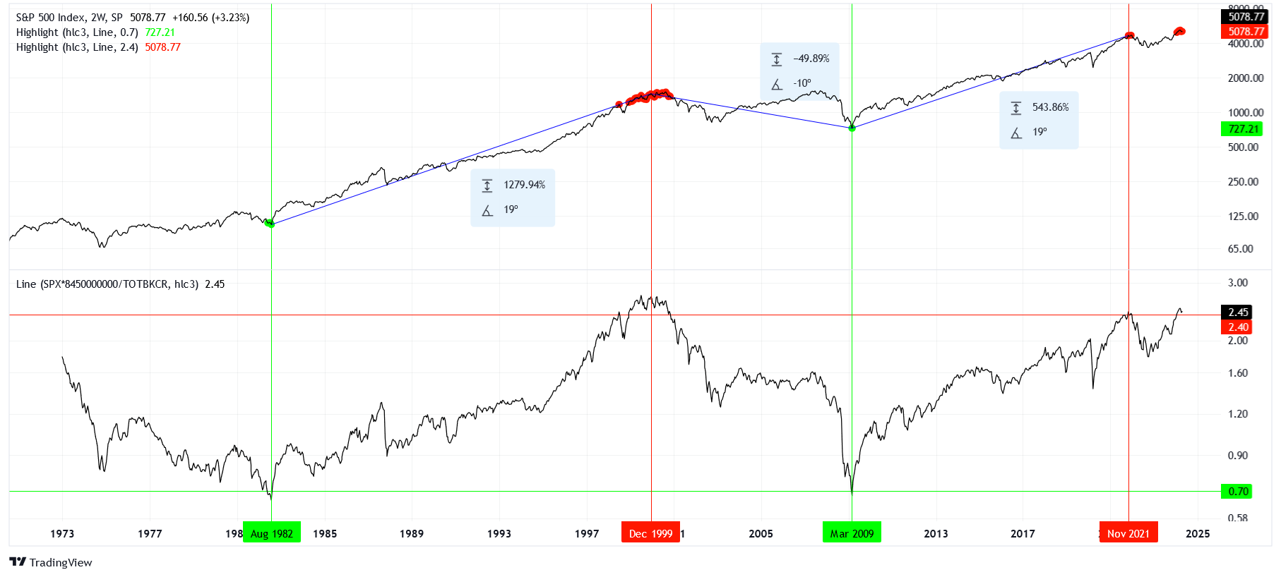 The scaling factor may seem arbitrary, but it turns the SPX into an analog of the total market capitalization of the U.S. equity market. Essentially, we are comparing the total value of the stock market to the total value of U.S. bank credit.