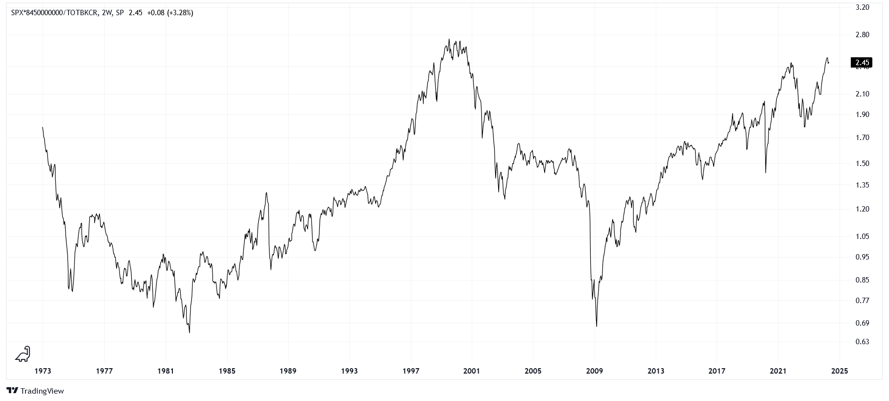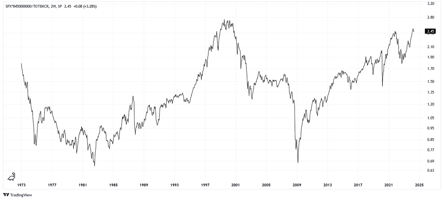 In late 2021 this spread reached the top of its range, dipped down in 2022, and now we’re back above 2.4 in 2024. For every dollar in bank credit, there are 240 cents in stock market value. Contrast this with a 1982 or a 2009 where for every dollar in bank credit there was only 70 cents in stock market vale.