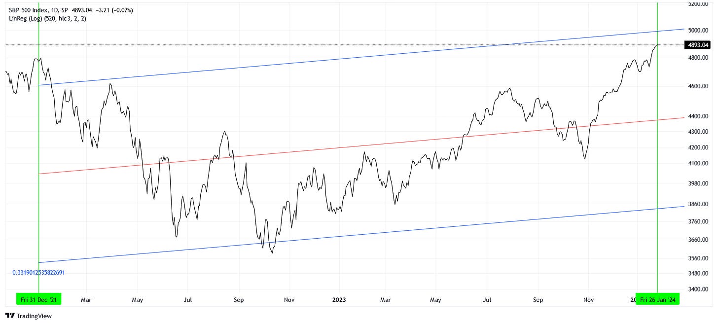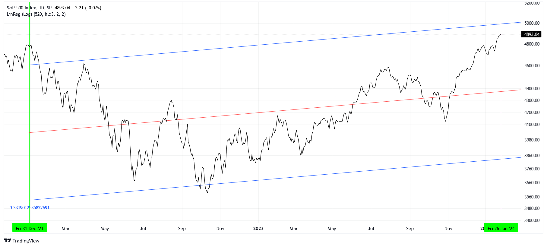 If we consider the last 520 days on the SPX, a log-linear regression model only captures 11% of the variation in the data, almost nothing. These 520 days had an overall return of 2.2% or a measly 1.06% annualized. Adding up the absolute movement and comparing it to what we got, only 0.55% of the movement was realized into a positive return.
