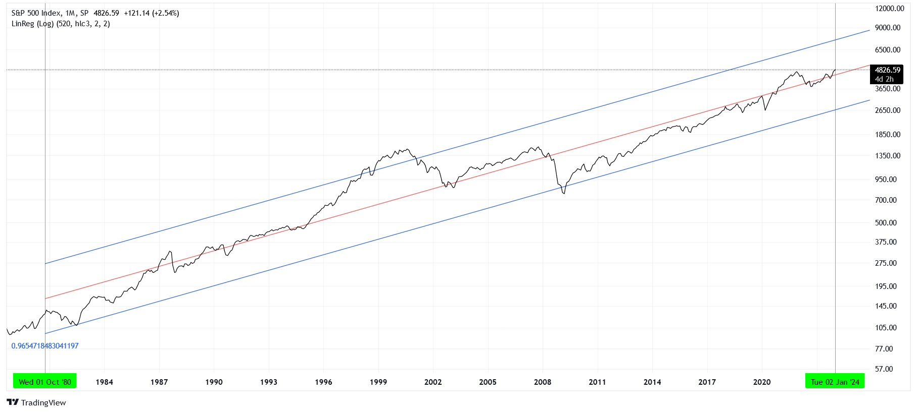 If we look at the last 520 months on the SPX, we can fit a log-linear regression model to the data with an R-squared value of 93.1%. This means that a straight line on a log view can capture 93.1% of the variation in the data, not bad! These 520 months had an overall return of 3716% or 8.8% annualized. Finally, if we were to add together the absolute length of both negative and positive returns and compare it to what we got, then 25.7% of the total movement was realized into a positive return.