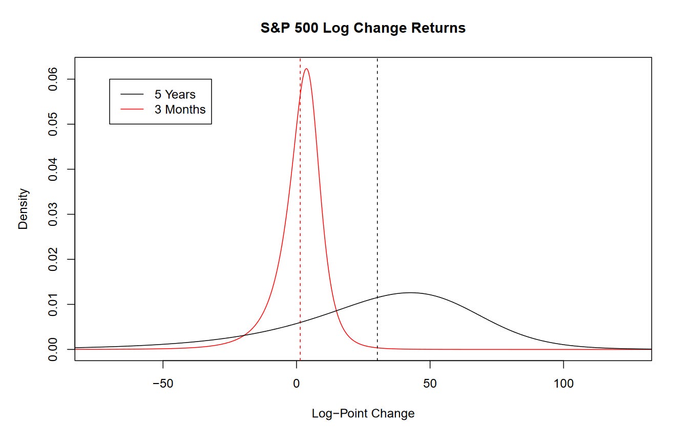 In the plot above, we observe two curves. The red curve represents the returns over a three-month duration, while the black curve shows the five-year returns. Imagine that five years represent more “time in the market” compared to “timing the market” every three months. The three-month returns are concentrated close to zero, while the black curve is flatter and peaks further into positive returns. It is easy to see that a large chunk of the five-year distribution has better returns than the three-month distribution.