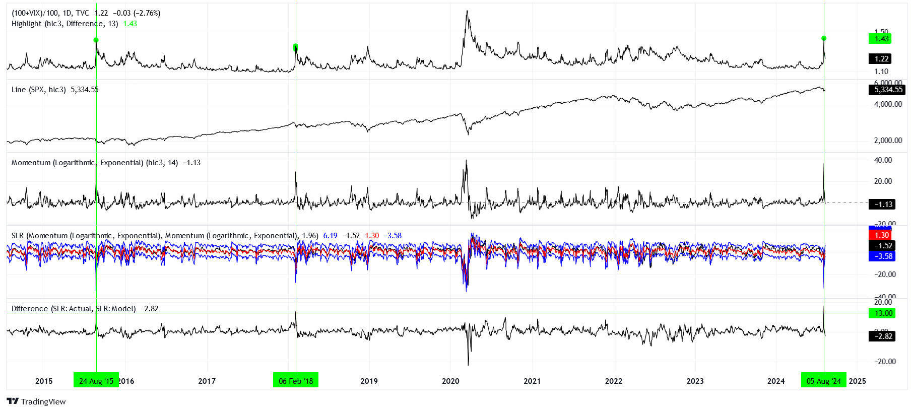 Working backwards, we can see that there was a large positive residual on August 5, 2024. This means that the actual 14-day momentum of the SPX fared much better that what we would have expected given the 14-day momentum of the VIX. There are a couple of other periods highlighted that had similar positive residuals.
